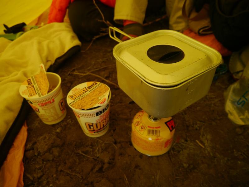 脇にツエルトを張らせてもらい、湯を沸かしてカップラーメンを食べて体を温めます。