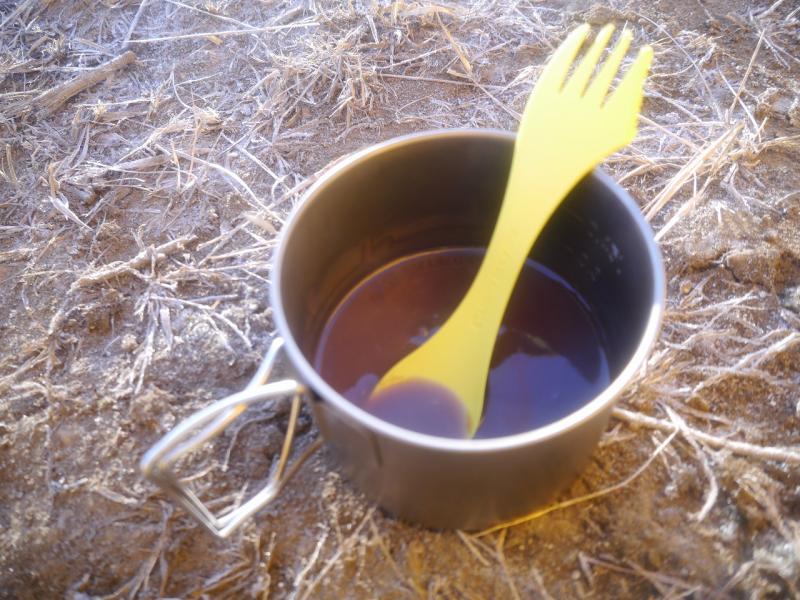 太陽が出ても寒さは収まりません。またツエルトに戻り、今度はスイーツタイム「おしるこ」を作って食べました。おなかも満足になったところで撤収し、下山開始。