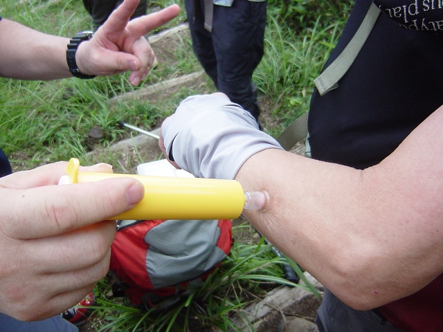 山頂から下山して来た方が「山頂はアブが多くて刺された」の一言で山頂はあきらめました。8月はブト・アブの大群が所々でたむろしており刺される被害が多いので必ず虫よけスプレーと、虫よけネット、刺された時の毒吸引器は必携です。また9月からはスズメバチも活動するのでスズメバチ撃退スプレーも持参しておいたほうがいいと思います。仙人滝近くでマムシにも遭遇しました。