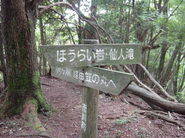 - 登山口案内版11:00⇒大鳥居11:05⇒笠形神社12:10⇒笠の丸13:30⇒山頂14:00⇒笠の丸14:40⇒ほうらい岩15:20⇒仙人滝16:00⇒登山口16:50