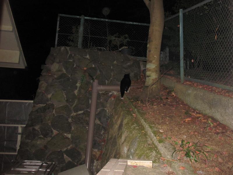 山頂に着いた頃には茶屋はもう店仕舞いをしていました。ちょうど日暮れの時間。少しずつ暗くなっていく辺りの景色や空の色、目の前に広がる丹沢山系の稜線、眼下の町並みの明かり、遠くに見える相模湖プレジャーフォレストの観覧車の明かり。とても綺麗でした。食べ物を狙う猫が1匹うろうろしていました。また山頂にも意外に人がいて、どうもヘッドランプを持たず、携帯電話の明かりで照らしているようでした。いくら整備された高尾山とは言え、夜は真っ暗ですのでヘッドランプは必ず持ってお出掛け下さい。