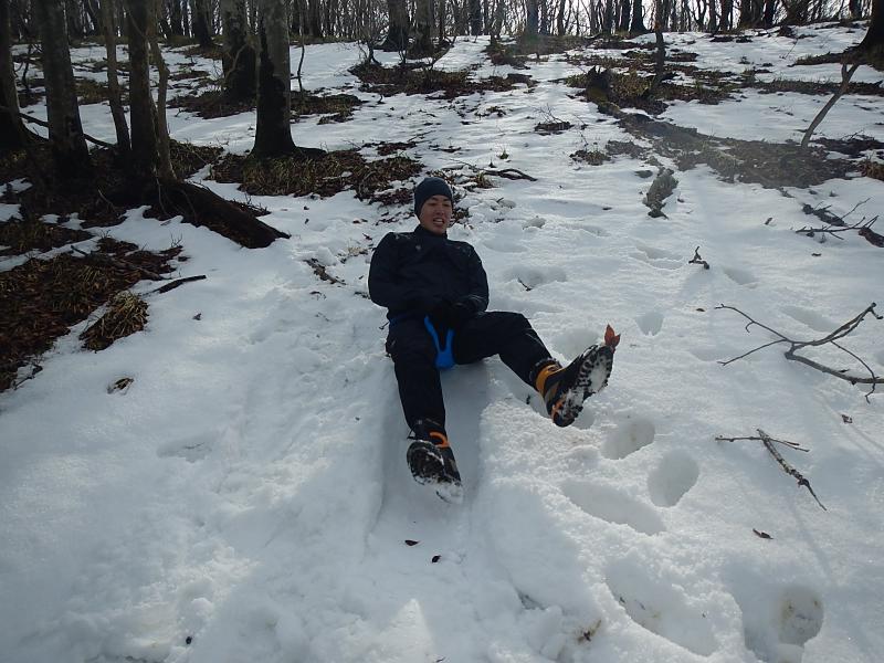 北斜面のみなんとか雪が残っており今回もまた無理矢理ソリを敢行。その後八雲ヶ原まで降りて