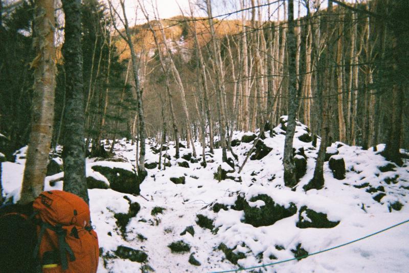 - 美濃戸口周辺はほとんど雪が無く問題なく夏道をトレースしました。アイゼンは登山道から外れる分岐で装着しました。