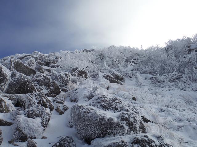 10本爪以上のアイゼン必携。山頂付近ピッケルはあった方が歩きやすい。