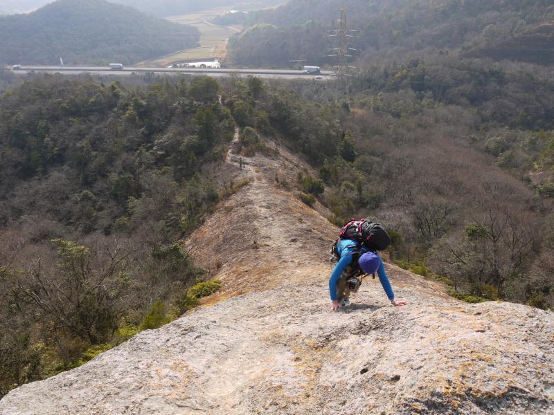 本コースのハイライト、紅山の岩斜面は遠目に見るよりも急ですが足場はしっかりしています。