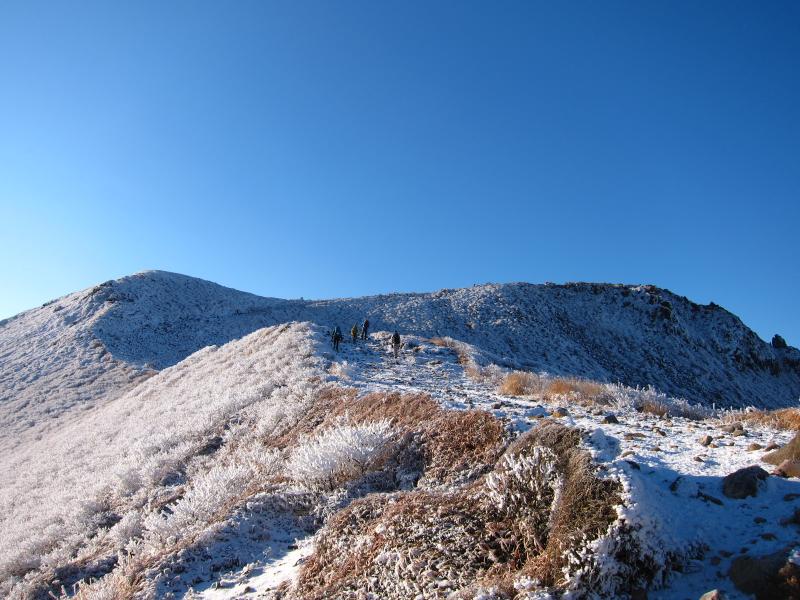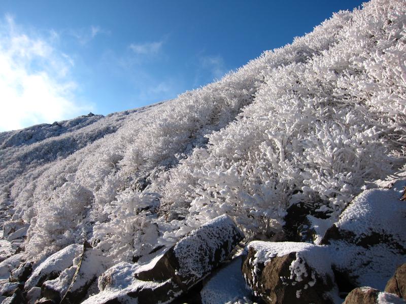 霧氷で白く覆われた山並みに何度も立ち止まり写真撮影に夢中になっていました。