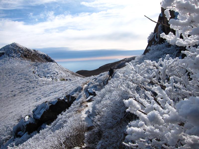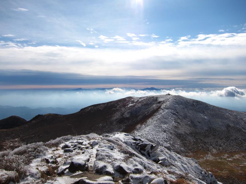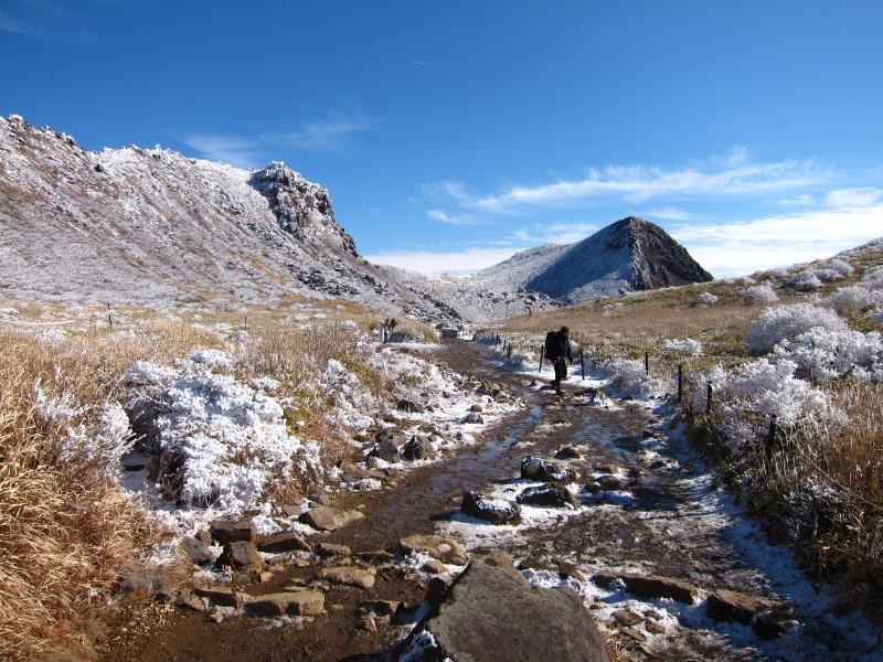 積雪はありませんでしたが岩の表面は凍結しており久住別れから軽アイゼンを装着すると良いと思います。今回は6本爪アイゼンを使用しました。