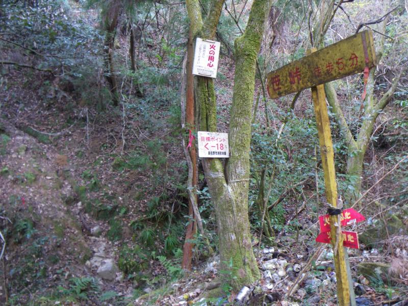 三峰山の登山道は神通温泉側の採石場で崩されいて、採石場の上を通過する登山道は通行禁止のようで、稲倉林道からササ峠経由で、火打越谷林道を下降するルートで登りましたが、今日の行程の半分以上が林道のような感じでした。ササ峠から上のカマ尾根はザレた尾根が少しあるくらいで、隣の梵天山へ上がる尾根のほうが嫌らしい感じでした。こちらも松茸山入山禁止ロープに導かれる感じで、時より樹林帯の隙間から関西空港と大阪湾を垣間見ながら、進んでいく感じです。ササ峠~城が峰間は思っていたより長い尾根で、暖かい時期は避けたいような松林がひたすら続きます。城が峰稜線から下山する八丁坂も倒木が多く、生草林道の方が快適そうでした。このあたりの山麗には林道が無数には走っていて、その起点を示す石柱がすごくきれいで新しいのが印象でした。