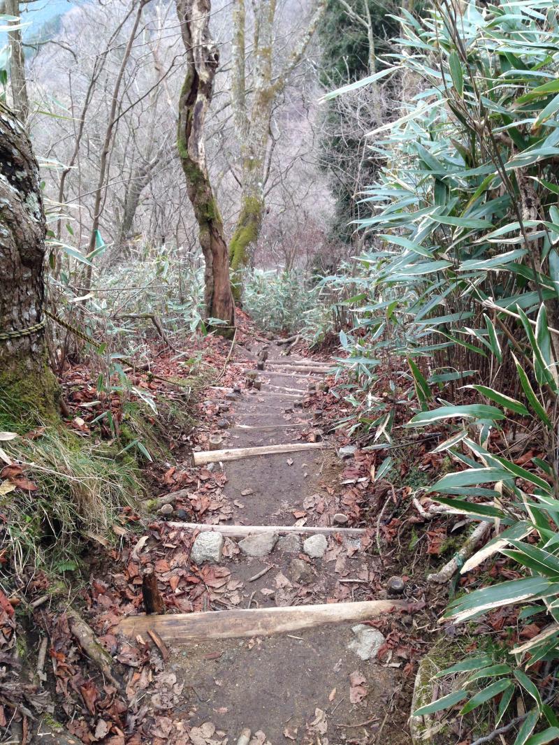 - 例年なら登山口から凍り付いてアイゼン必携のはずが、今回は雪は全くなく、凍結しているところも見られませんでした。まるで冬直前の12月上旬のイメージでした。