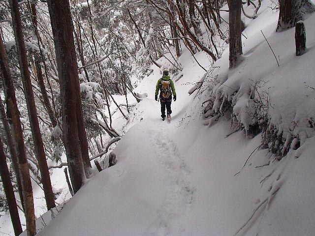山上辻から法力峠に向かって尾根を進むルートがネットで紹介されています。このルートは目印も少なくGPSなど自分の位置がわかる道具があると重宝します。下りに使う場合、尾根が分かれる部分が何か所かあり、方向を間違えないことが重要。トレースがないと迷いやすいルートだといえます。
