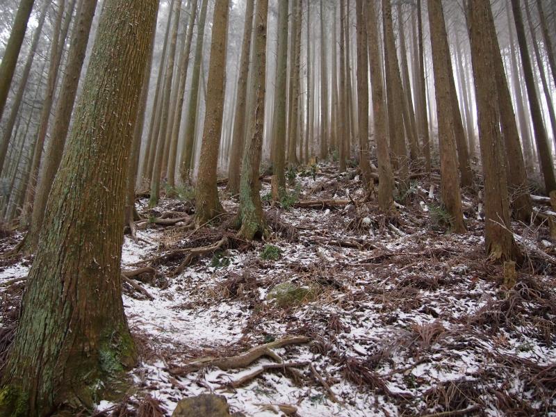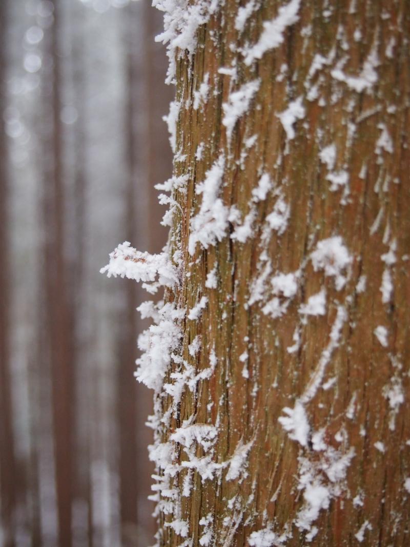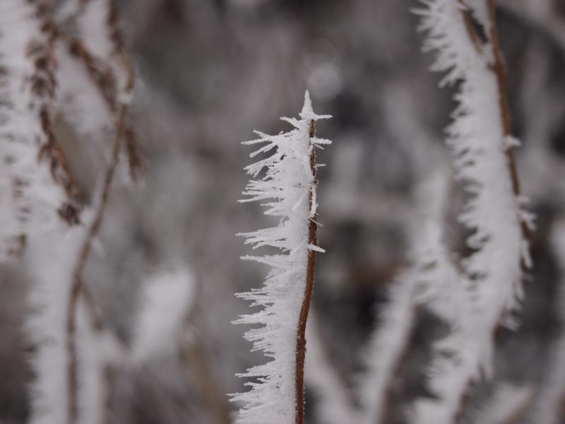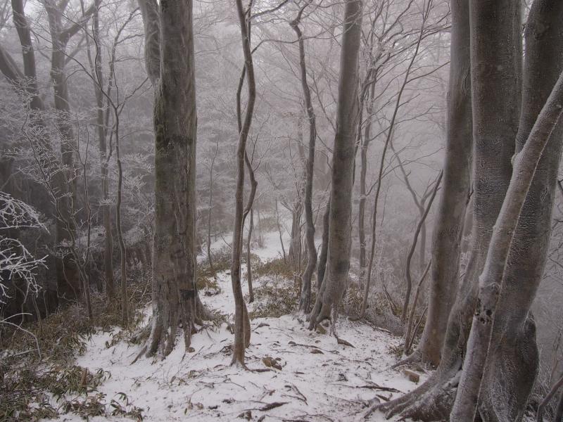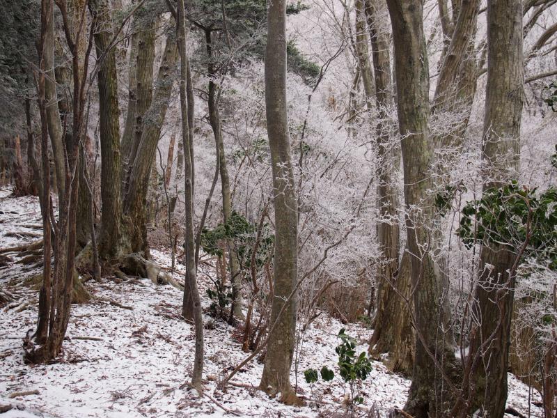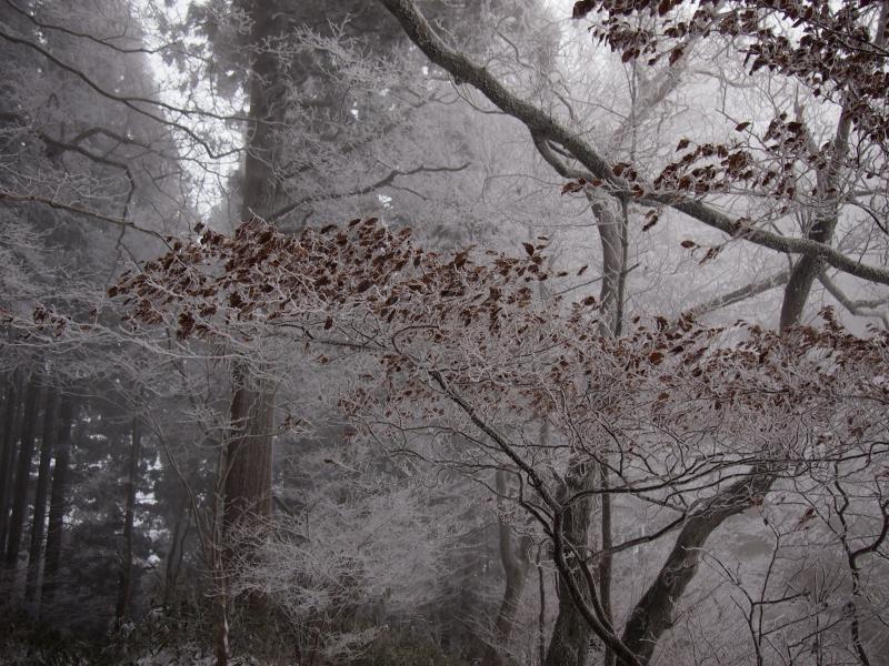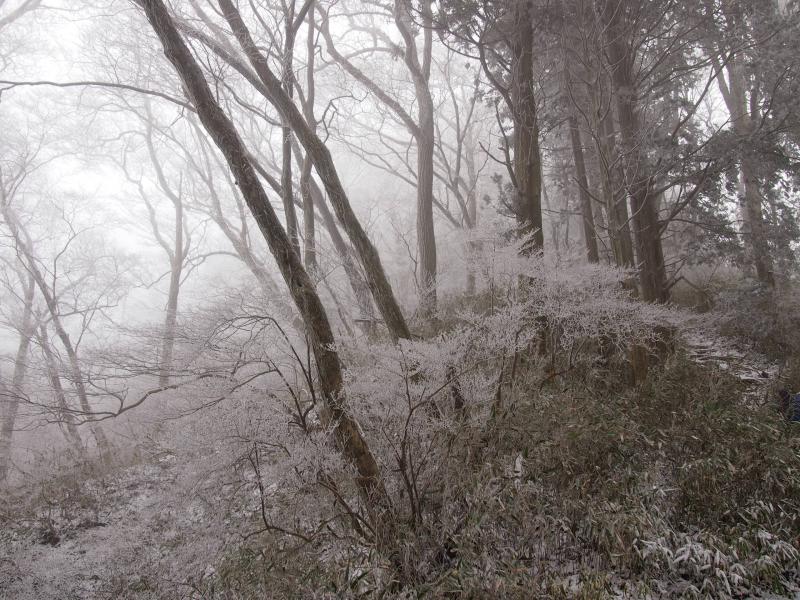 989のピーク近くからようやく雪の花、樹氷がみられるように。山頂部は数センチの積雪あり。林道も凍結しておりアイゼン無しではかなり滑ります。