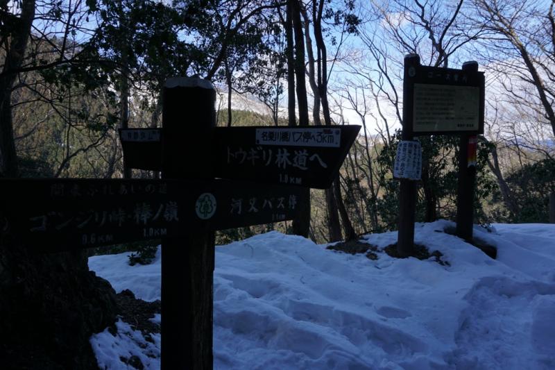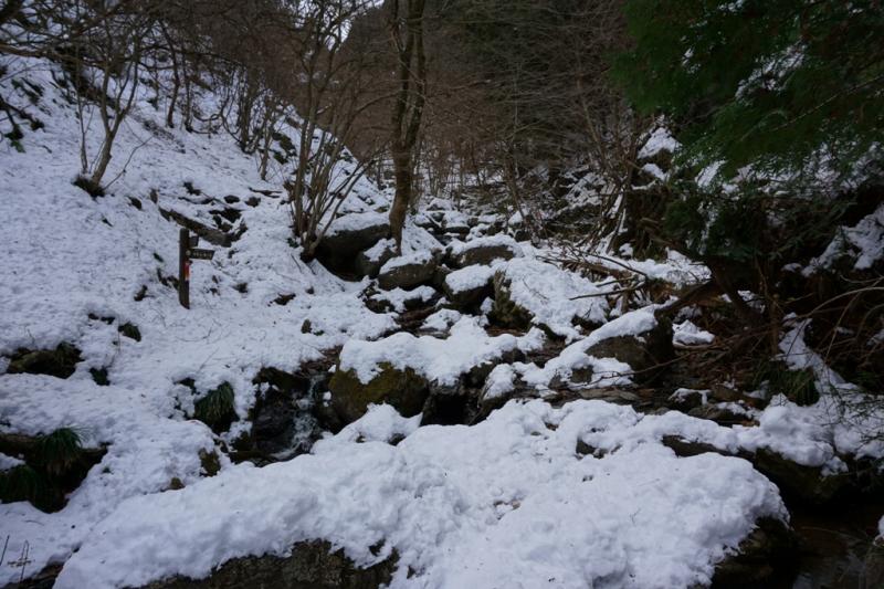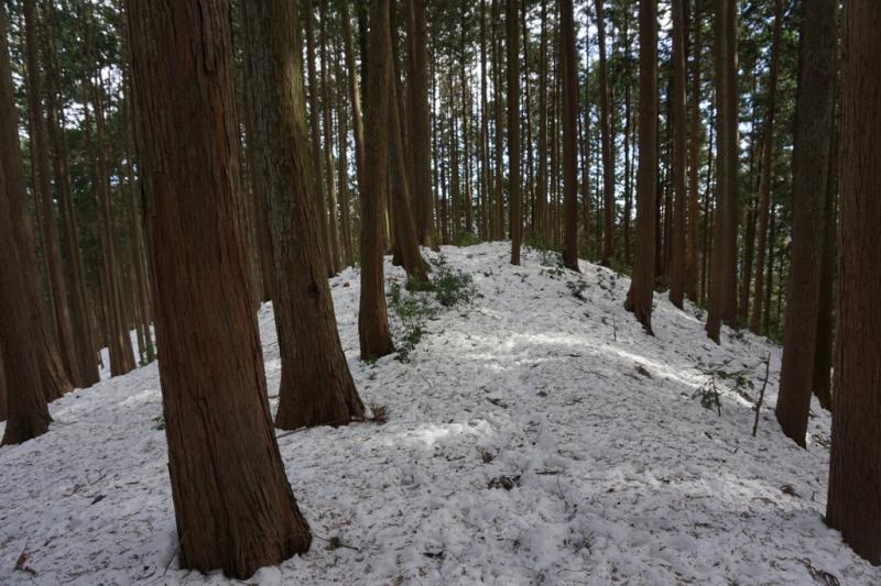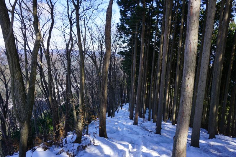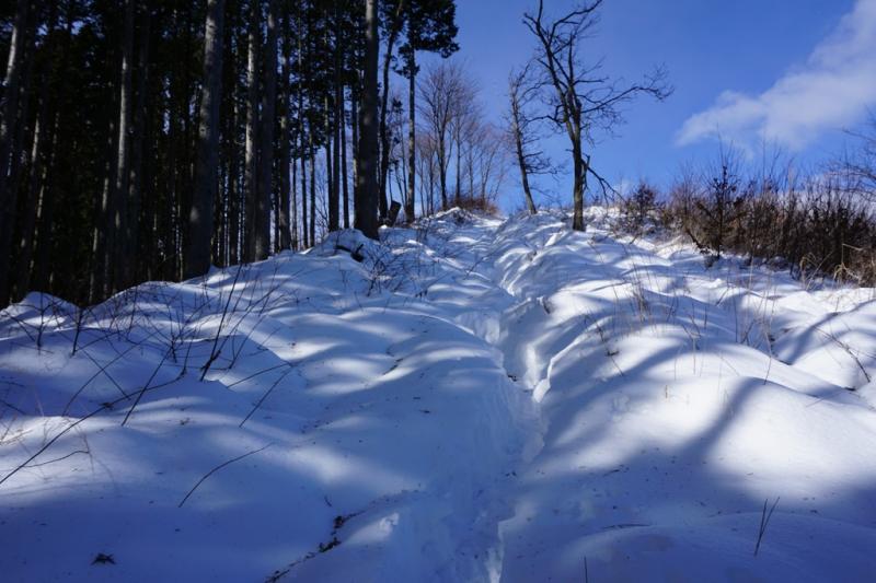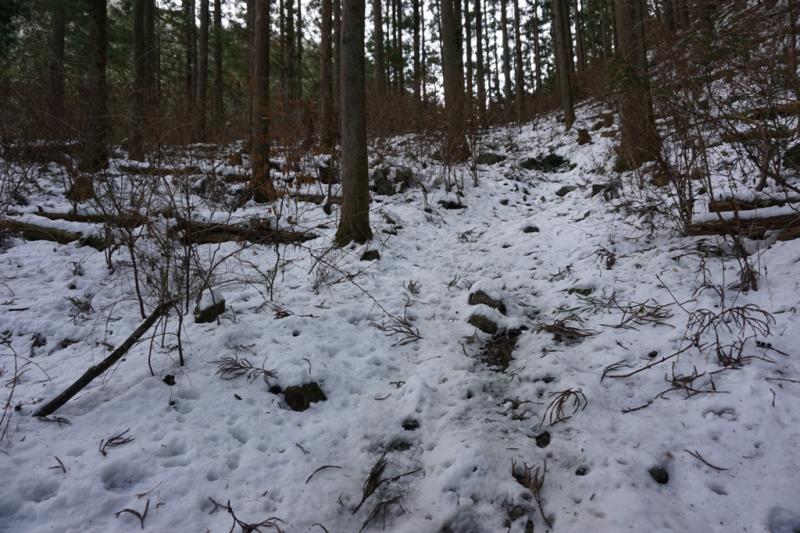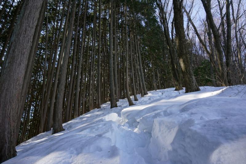 - 登山口から雪があり。林道過ぎるとひざ下までの積雪。トレースがついていたので迷いませんでした。下りで通った植林地帯は踏み跡が見えにくく、かつ目印も少ないので道迷いに注意。