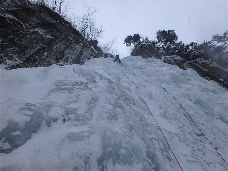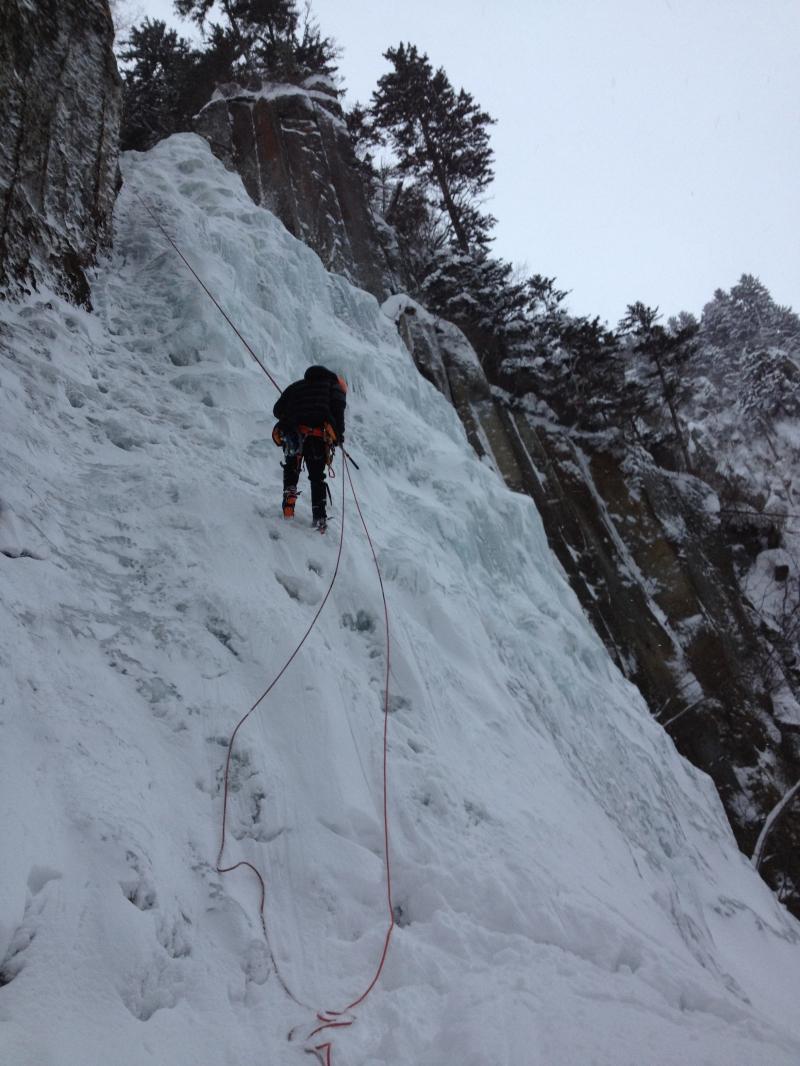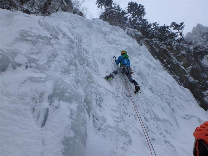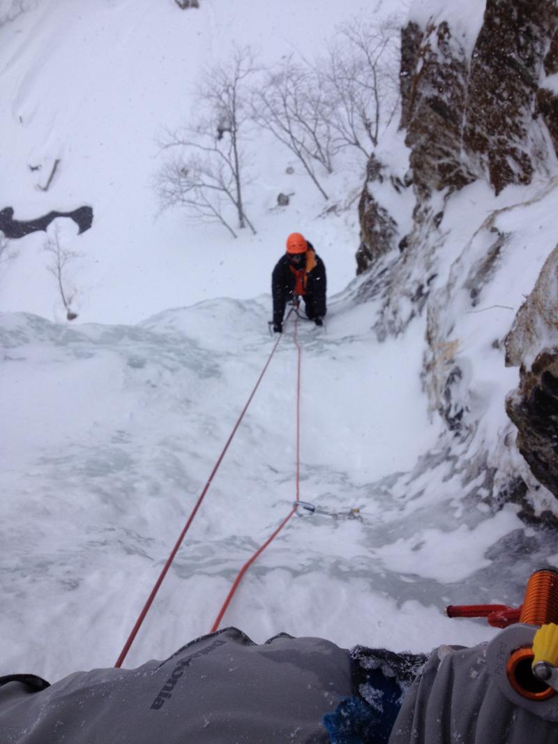 1P目WI4 段状の氷を快適に登っていき岩壁のアンカーもしくはスクリュービレイ。