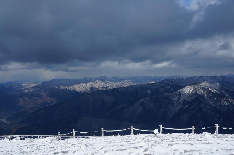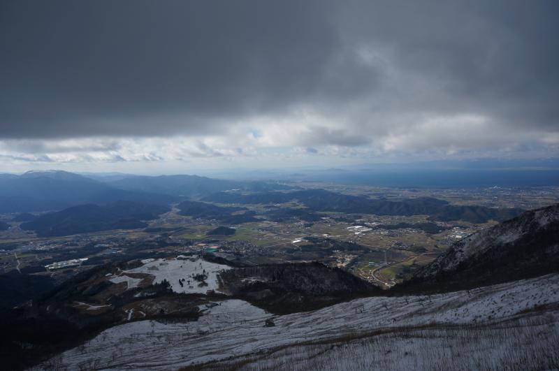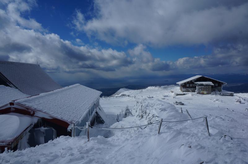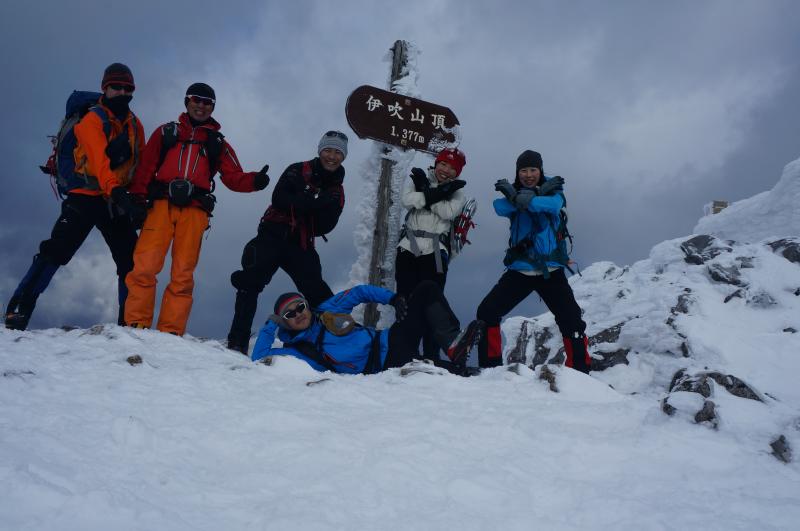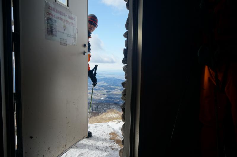 寒波襲来の予報を受け、登山口で積雪&降雪を予想していました。除雪道具を車に積み込み出発。また、前日から「状況が悪ければ撤退」を繰り返し話し合っていたのですが…。到着してみると山頂がくっきり見えるほどの青空。気温はかなり低めですが「こりゃラッキー♪」。ということで、皆明るい見通しを持って出発。それにしても雪が少ないなー(^_^;) いつアイゼン&ピッケル歩行に切り替えるか、と思っていましたが、8合目を過ぎても積雪は深くなく、結局アイゼン、ピッケルを使うことなく山頂に到着しました。山頂ではさらに晴れ間も広がり、360度の大展望!よい写真が撮れました。エビのしっぽもなかなかの発達具合。はしゃいでいるうちに後続の京都店・岡山駅前店のグループ3人とも合流。6合目までは楽しい下山となりました。※6合目避難小屋で京都店・岡山店グループは昼食休憩。我々は下山。