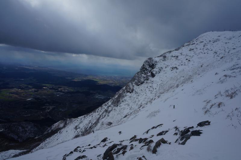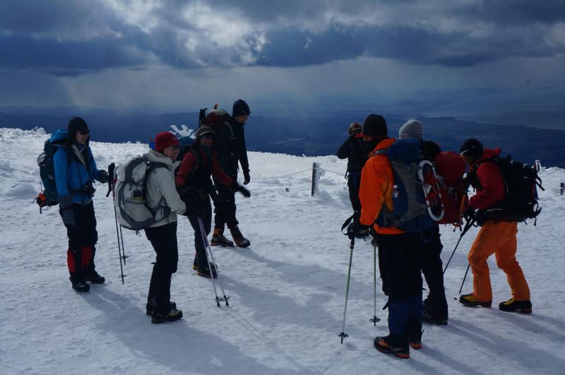 - 夏道上を行きます。3合目からうっすり積雪。8合目辺りで「ふくらはぎの下」くらいの積雪です。登りは基本的にアイゼン無しで登れましたが、8合目より上部のトラバース、凍結箇所に不安があれば装着したほうがよいでしょう。もちろん12本爪のアイゼンです。下りはややスピードも出るのでアイゼンの出番でしょう。6合目の避難小屋辺りで外すくらいの積雪でした。