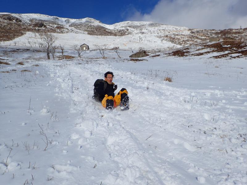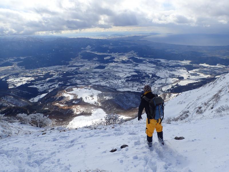 下りでは滑りやすい雪に変わっており、私は10本爪アイゼンをつけて下りました。