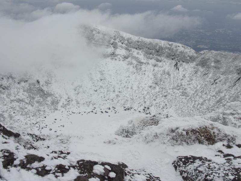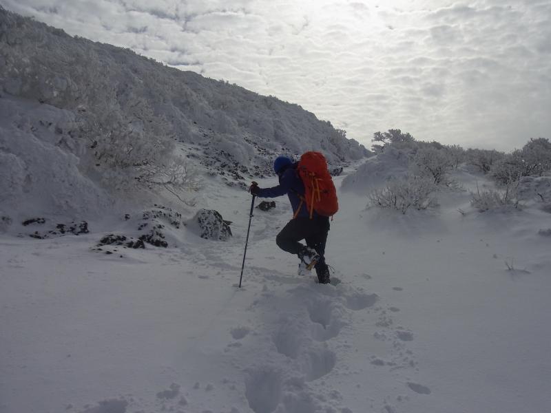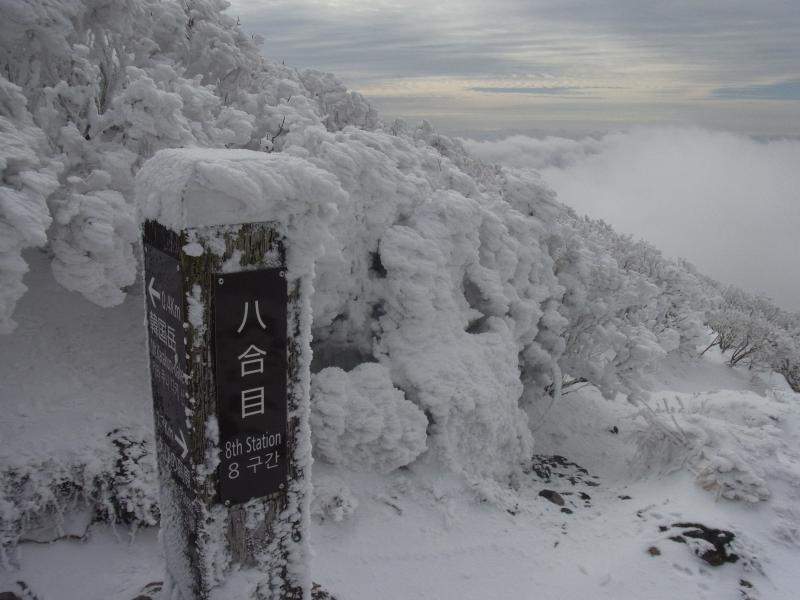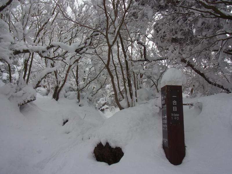 - 駐車場(50分)新雪遊び込み1合目(45分)5合目(30分)8合目(15分)韓国岳山頂(90分)駐車場