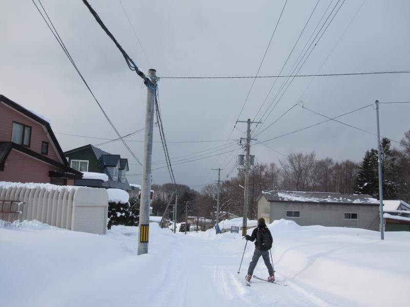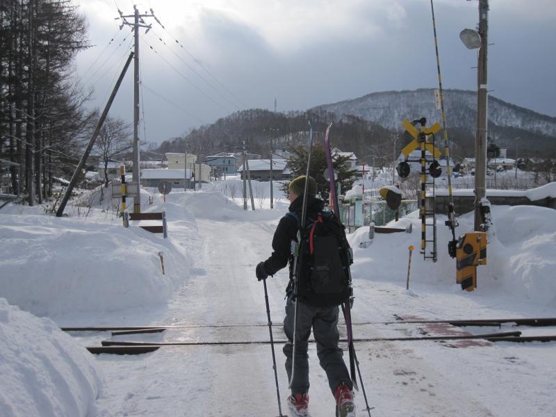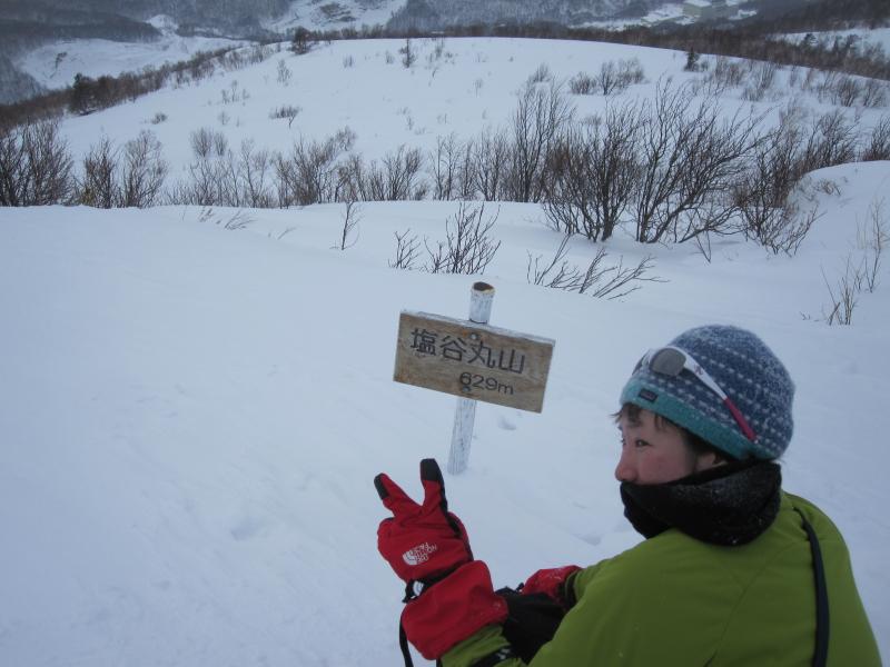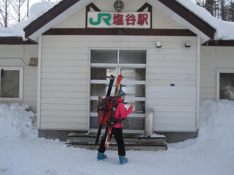 北海道小樽市の地元民に愛されよく登られている低山BCスキーで人気の、塩谷丸山にスキーをしに登って来ました。シールが準備出来なかったので、登りはスノーシューをお借りしました。塩谷駅からスキー靴で歩いて登山口まで行くことが出来て、とてもアクセス良好です。登山口から早速スノーシューを装着、山﨑さんはスキーを履いて出発。登山口で同じタイミングになったベテランの雰囲気プンプンの男性に、先に行って頂きました。その後下って来た3人組のパーティー2組と遭遇しました。その内の一人だけボーダーでした。