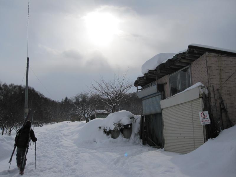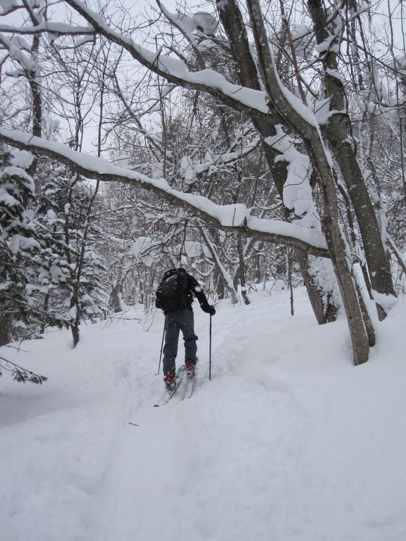 スノーシューはなかなか難儀しました。登ったと思ったらまた平坦、下りになったり、少しきついトラバースになったりする頻繁な地形の変化と、雪が深いこと、結構な急登が出てくることなどで、太ももがそのうちぶち切れるのではないかと思う程かなり体力を消耗しました。スキーではどれだけ楽だろうかと山﨑さんを見ると、シールに雪がくっ付いて斜面で滑るらしく(15年も前のシールで手入れをしてないだとか何とかで)そちらもかなり苦労していて、お互いにかなりひっちゃかめっちゃかになっていました。ルートミスもあり登りがきつくて、コースタイムは2時間程度なのですが大幅に3時間掛けて何とか登頂しました。登頂は無理かも知れないと予めタイムリミットを設定していて、まさにそのタイムリミットにジャストミートという感じで、かなりぎりぎりでの登頂でした。
