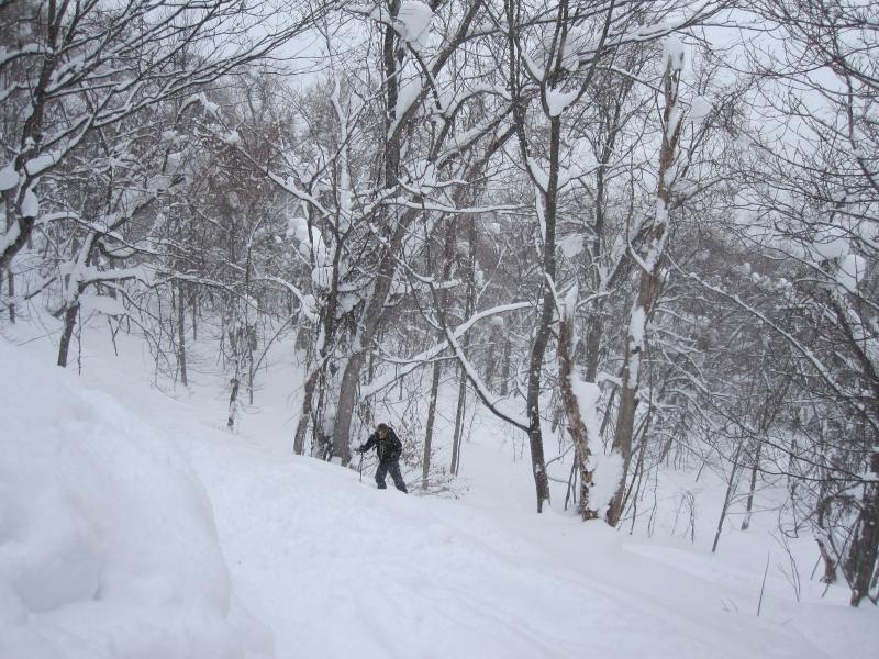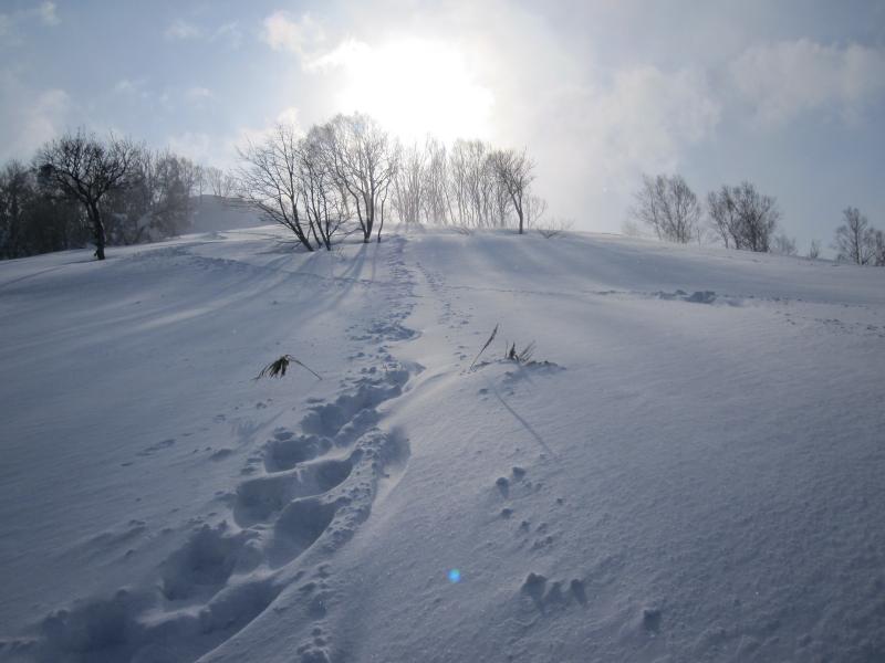 - 雪山のシーズンは夏道とは異なり冬尾根ルートになります。北海道新聞社から発刊されている「北海道雪山ガイド」が参考になります。前日にも降雪はありましたがトレースは明瞭。ただいくつも登りと下りのラインが交差していて、我らは先に付いていた登りのトレースを頼りに登ったら目印になるトドマツを見落とし、この本にある下りの沢コースを登って来たようです。