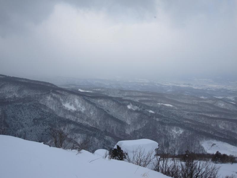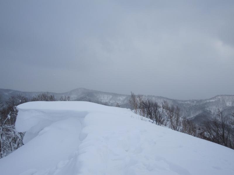 しばらくは緩やかに林の中を進み、300m台地前後から急斜面となります。450m台地の疎林帯からはもうひと踏ん張り。既に背後には絶景が広がっています。山頂は雪庇が出来ていますので近付かないように。