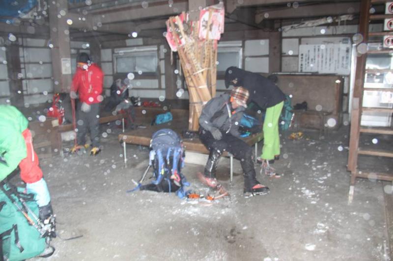 先に山頂に行き、下山して合流と考え九合まで下山すると、登ってくるかたに、団体で固まってみな登ってきていると教えていただき小屋に登り返し待機しました。みなと合流して、休憩後再び山頂へ、吹雪で早々に下山しました。