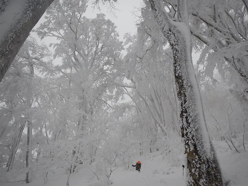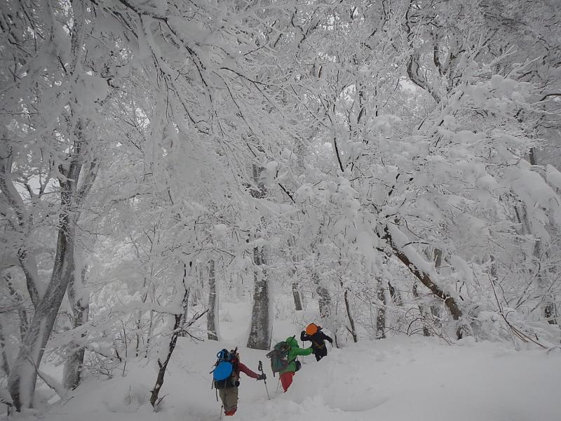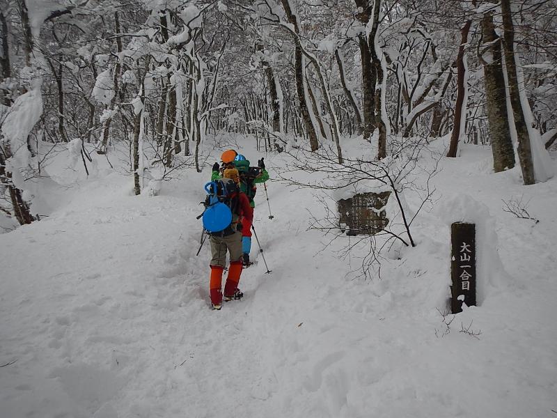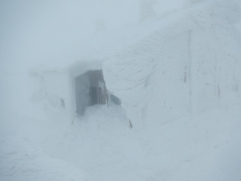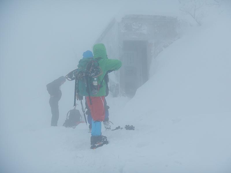 3合目あたりから木々に付く雪が多くなりきれいな樹氷が見られます。五合目からアイゼンを装着し登りに備えました。6合目を登っていく途中に一瞬ですが晴れ渡り日本海が一望できました。8合目からはまたガスに覆われ風も強くなり、途中トレースがわからなくなるところもありました。視界が5mも無い時もあり、トレースを外すと腰まで埋まります。慎重にトレースを探しながらようやく頂上小屋に到着。