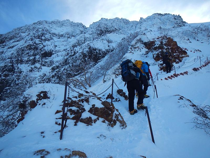 中岳までの下りは、傾斜きつく ザイル確保が必要な場合もあります。