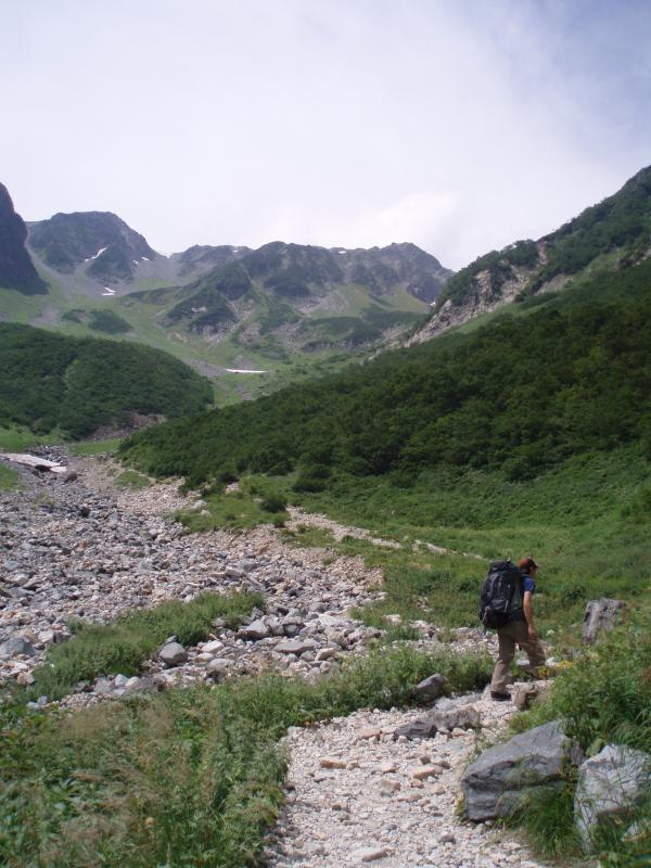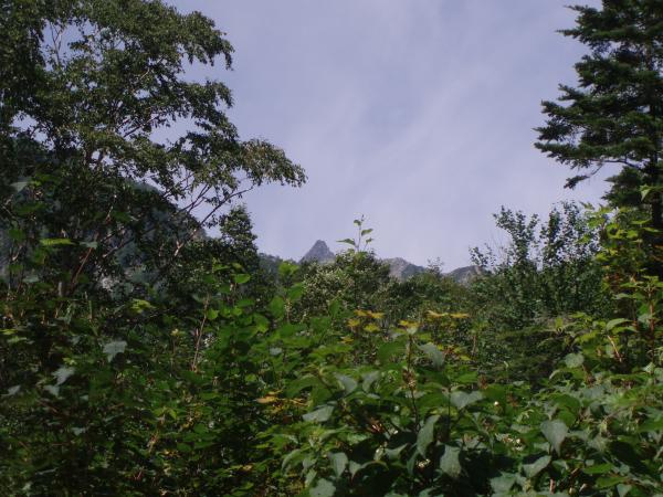 槍沢ロッヂを過ぎ、ババ平キャンプ地まではちょっと登る程度ですが、その先から一気に日影がなくなります。