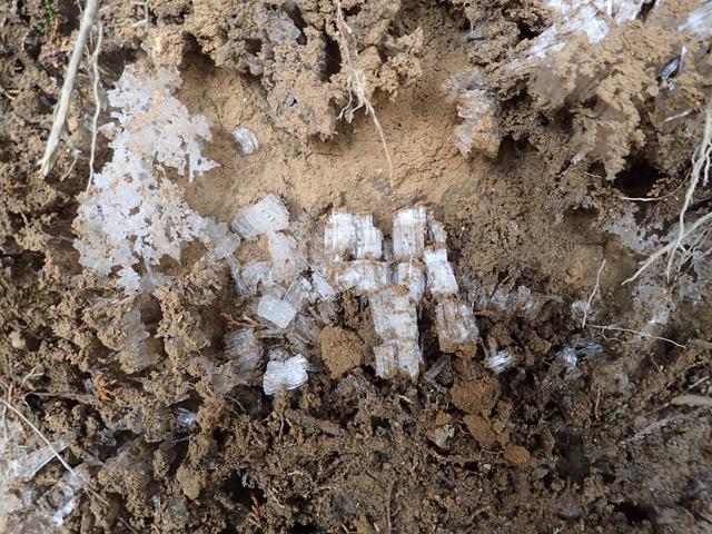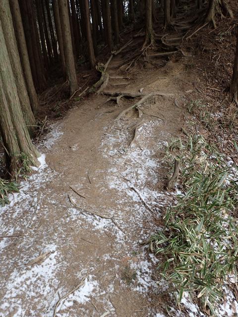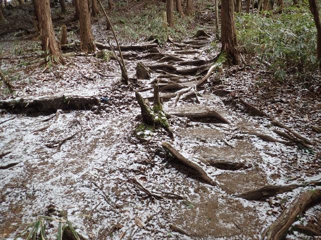 土の中にある水分が氷って登山道自体はアイスバーン状態になっていてアイゼンは一部必要でした。