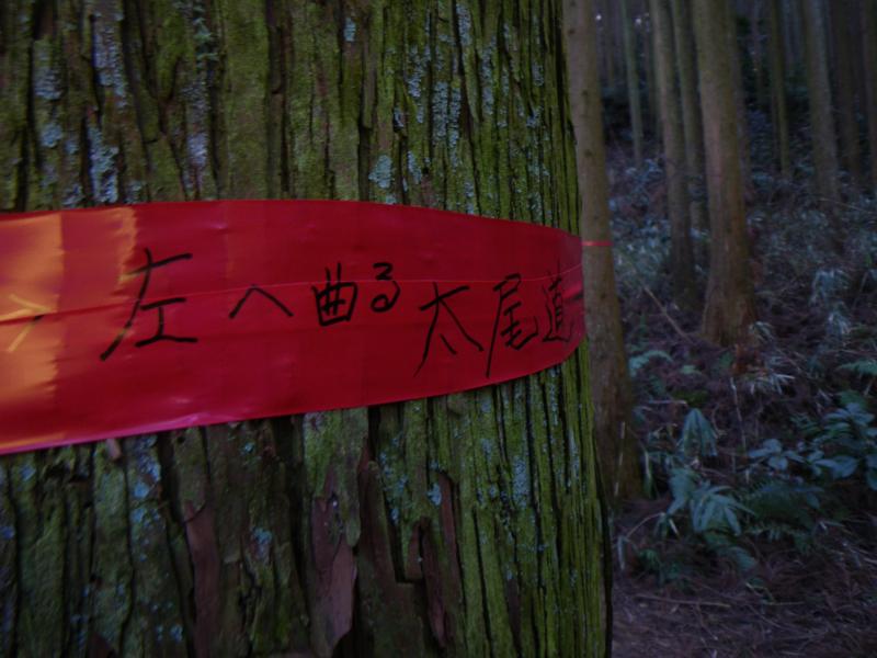 ④太尾道は石ブテ谷を越えてすぐに出てくる橋を渡り、林道に入ります。すぐに、杉の木に太尾道と手書きに書かれたテープが巻いてあります。