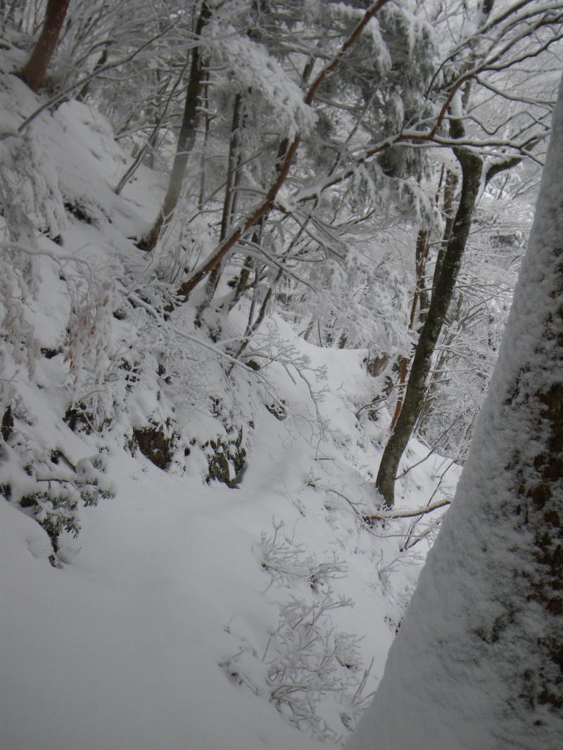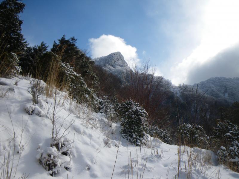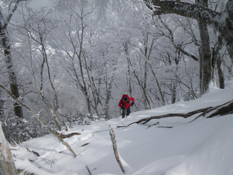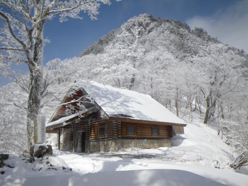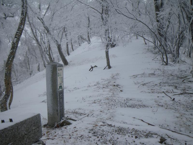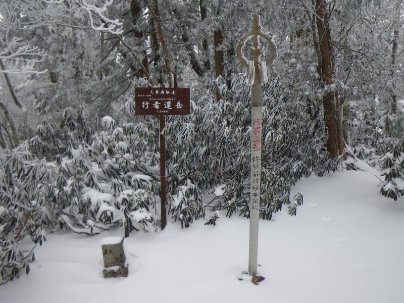 行者還岳(ぎょうじゃかえりだけ・1546m)は大峰主稜線上にあり、関西百名山の一つでその険しい山容により、役行者をして一度は引き返させたという伝承から名前の由来。夏の行者還岳なら国道309号で行者還トンネルから取り付けば苦労しないですが、冬は通行止になるのでそうはいきません。今回は大川口からダイレクトに目指しました。旧関電道を使い、最短で頂上へ上がる道は大川口の吊橋が破損している為に川追川を渡渉するのが最大の難関でしたが、うまくジャンプでかわして、尾根に取り付けました。今日は昨日の新雪のおかげで大川口から雪の道になり快適そのものでした。この旧関電道は1250m付近でトラバースして行者還岳を右から巻いていきますが、私達はそのマーキングを見失い、そのまま尾根を進んで、行者還岳の東側の尾根から頂上に出ましたが、こちらにもマーキングがあり、嫌な冬のトラバースをするよりはこちらのほうがいいのかもしれません。頂上付近は展望はないですが霧氷・樹氷の宝庫、また頂上自体は風裏になるので絶好の休憩所ですが、きれいな行者還岳避難小屋はもっと快適で、ここで泊まってみたい気分になります。帰りは小坪谷コースから下りましたが、夏場は崩壊していて、やらしいトラバースがあるも、雪が覆ってくれると関係がなくなり、あっという間に下山できました。しかし、凍結していれば恐ろしいとトラバースになるのだろうと予想ができます。今日のような新雪がかぶった登山道ではあえてアイゼンは付けずに歩いたほうが正解ですが、下に岩なのか木の枝があるかわからない状態ではもう少しだけ雪があるともっと快適だったろうに思います。