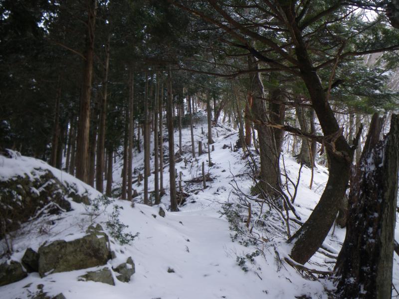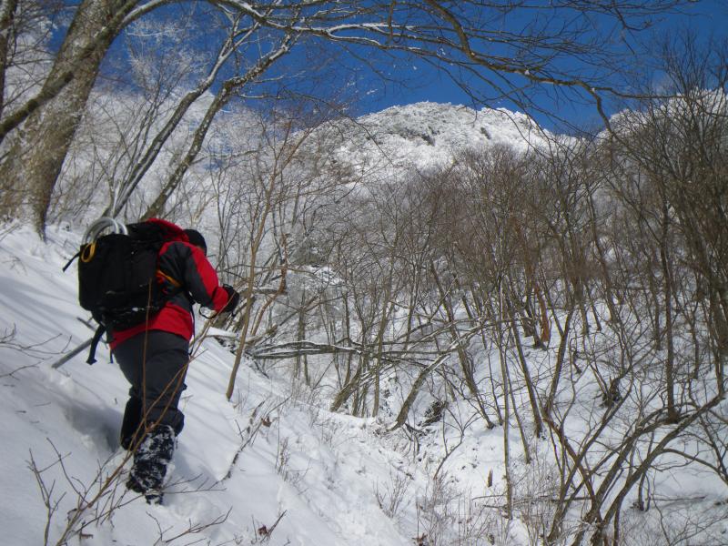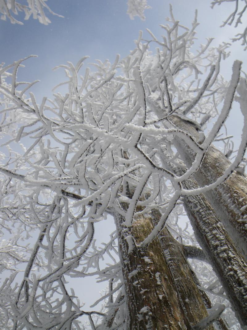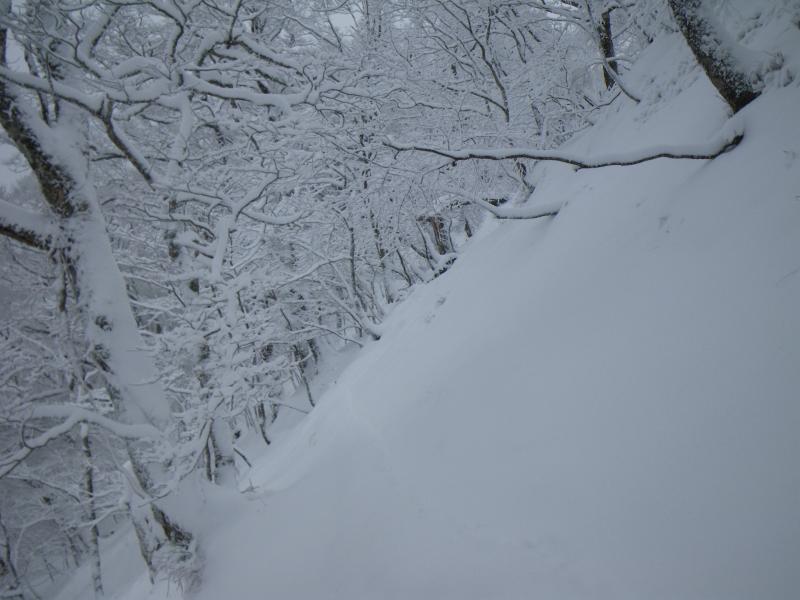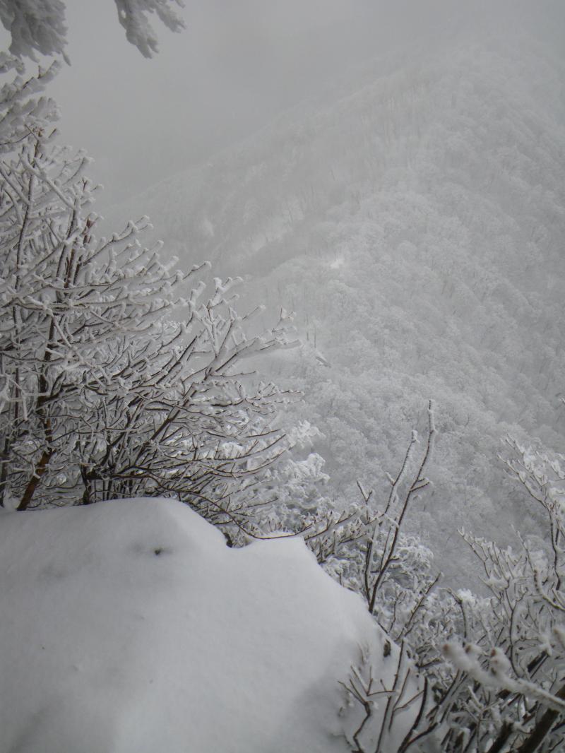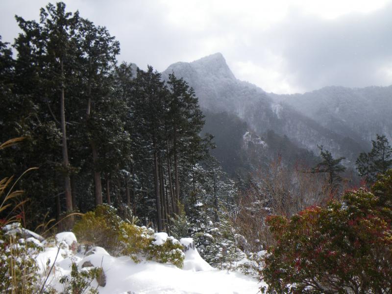 行者還岳(ぎょうじゃかえりだけ・1546m)は大峰主稜線上にあり、関西百名山の一つでその険しい山容により、役行者をして一度は引き返させたという伝承から名前の由来。夏の行者還岳なら国道309号で行者還トンネルから取り付けば苦労しないですが、冬は通行止になるのでそうはいきません。今回は大川口からダイレクトに目指しました。旧関電道を使い、最短で頂上へ上がる道は大川口の吊橋が破損している為に川追川を渡渉するのが最大の難関でしたが、うまくジャンプでかわして、尾根に取り付けました。今日は昨日の新雪のおかげで大川口から雪の道になり快適そのものでした。この旧関電道は1250m付近でトラバースして行者還岳を右から巻いていきますが、私達はそのマーキングを見失い、そのまま尾根を進んで、行者還岳の東側の尾根から頂上に出ましたが、こちらにもマーキングがあり、嫌な冬のトラバースをするよりはこちらのほうがいいのかもしれません。頂上付近は展望はないですが霧氷・樹氷の宝庫、また頂上自体は風裏になるので絶好の休憩所ですが、きれいな行者還岳避難小屋はもっと快適で、ここで泊まってみたい気分になります。帰りは小坪谷コースから下りましたが、夏場は崩壊していて、やらしいトラバースがあるも、雪が覆ってくれると関係がなくなり、あっという間に下山できました。しかし、凍結していれば恐ろしいとトラバースになるのだろうと予想ができます。今日のような新雪がかぶった登山道ではあえてアイゼンは付けずに歩いたほうが正解ですが、下に岩なのか木の枝があるかわからない状態ではもう少しだけ雪があるともっと快適だったろうに思います。