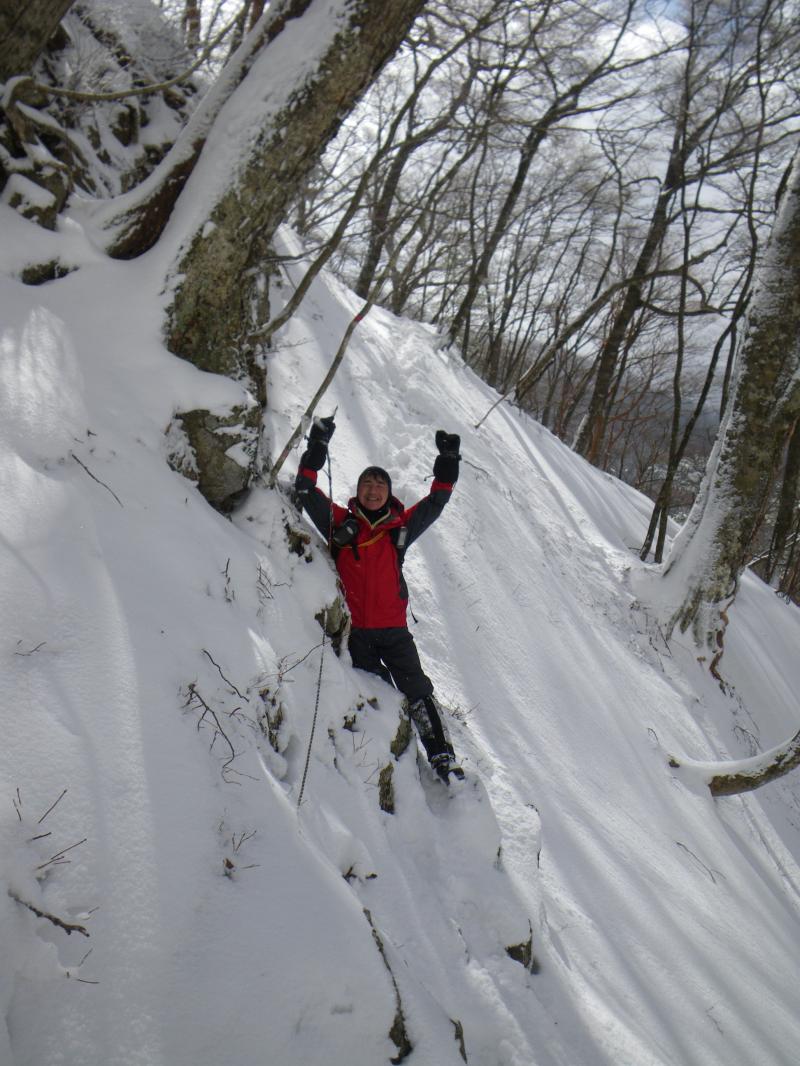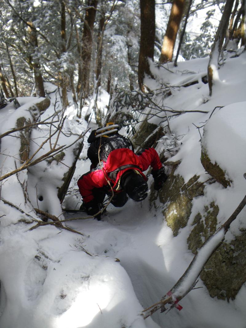 ⑥直進すると、1か所だけ岩場があり、ルンゼ状になっていますが、木の根があり、難しくはありません