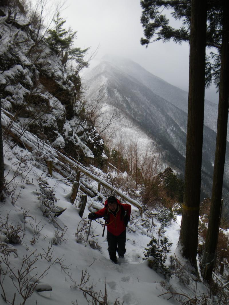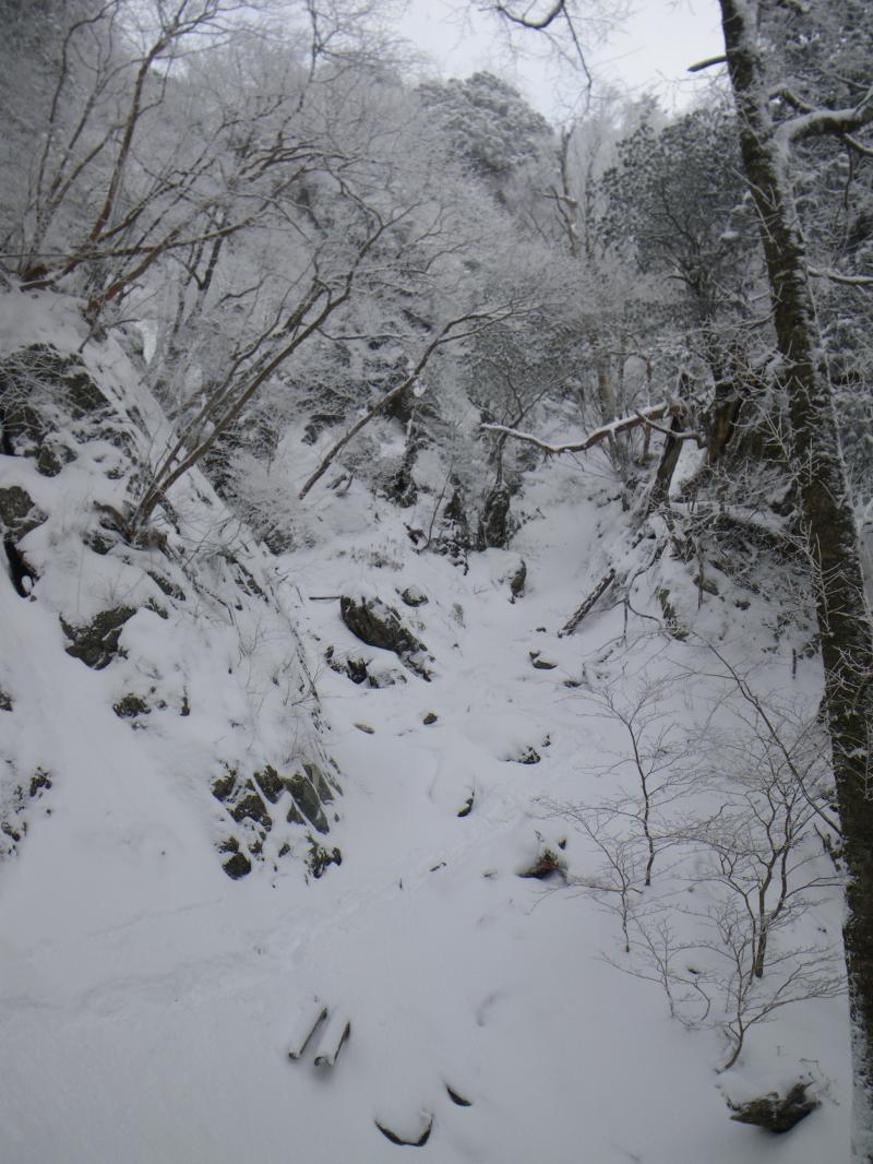 ⑨小屋までの奥駆道は頂上をトラバースしていて、梯子場が出てきますが、中途半端に埋まっているので歩きにくく、ここも凍結時は注意です
