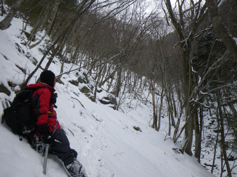 ⑫小坪谷ルートはトラバースが多く、凍結時は注意。夏場に崩壊している箇所は積雪ですべて埋まるとわからなくなっていました。下部は沢沿いですが、マーキングがたくさんあります。