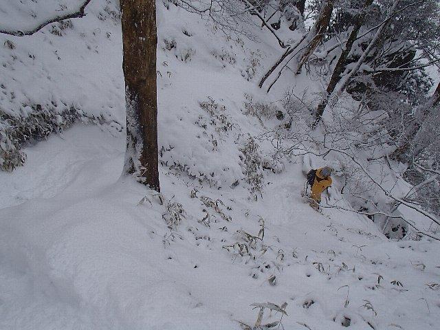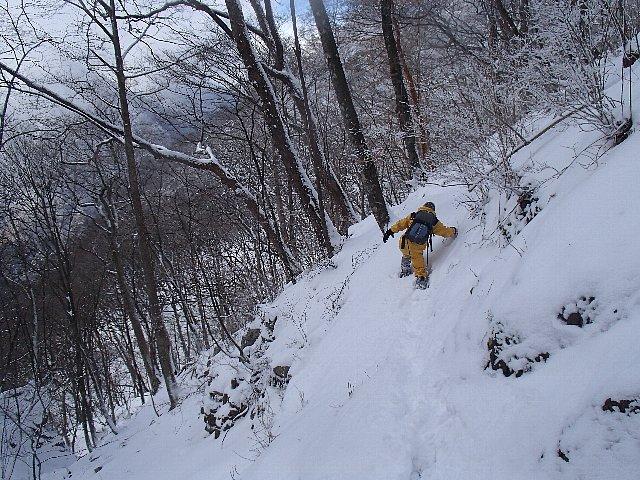 主稜線上でも深い雪に悩まされることなく、軽い雪を足で蹴散らしながら歩ける程度。