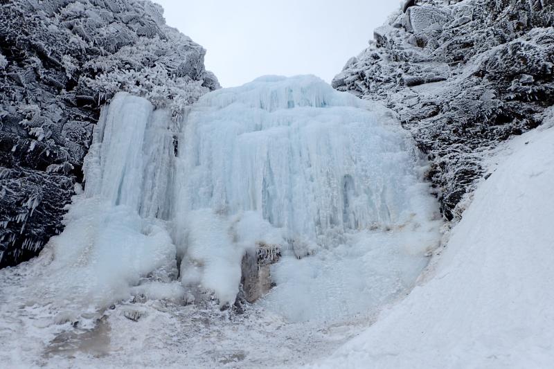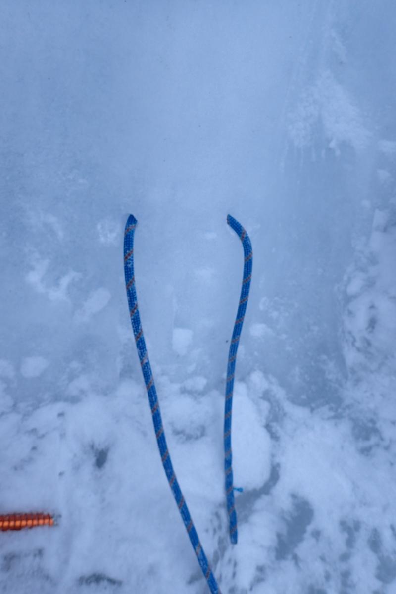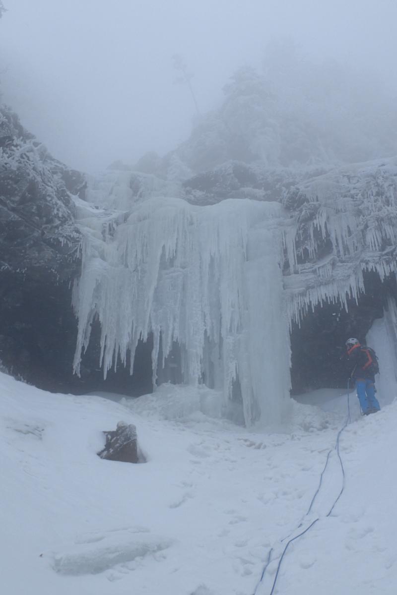 ジョウゴ沢を詰めた所にあるナイアガラの滝では2パーティー取りついていましたが、一番右でリードで登ったあと、TRで真ん中のラインを1本上る頃には貸し切りになりましたが、風が強くとても寒くなってしまい、赤岳鉱泉へ撤退しました。