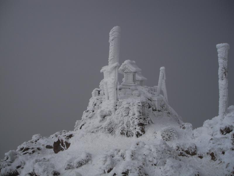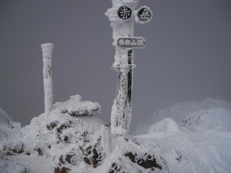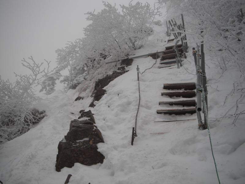 が、森林限界を超えた辺りから強風が吹きつけてきました。おまけにガスまで湧いてくる始末。時折見える晴れ間に期待しつつ最後の岩場に取り掛かります。クサリが出ていたので躊躇せず利用しながら山頂へ。山頂の様子は下の写真をご覧ください。とほほ。