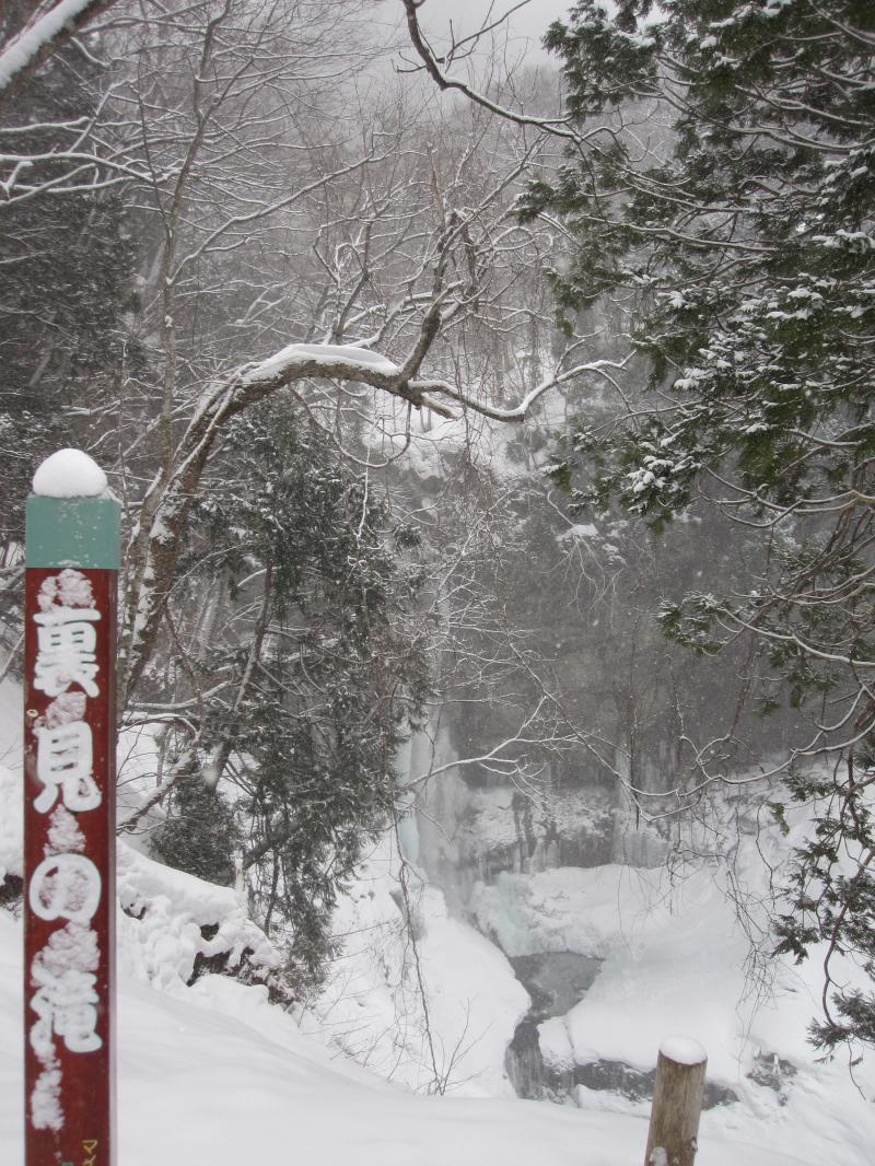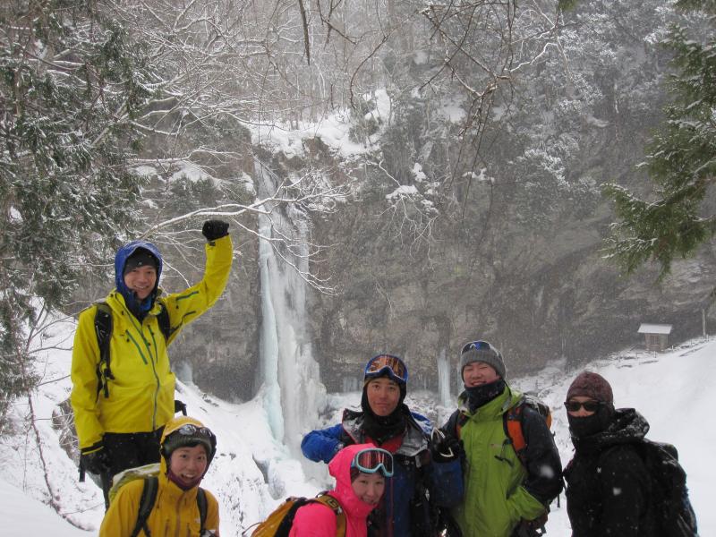 スタート時間がのんびりしていたのと、出だしで少し迷ってしまったこと、曇り空の下雪がしんしん降り続いていたことで、目的地の裏見の滝まで辿り着けるか不安でしたが、どうにか予定のタイムスケジュールぎりぎりでゴールすることが出来ました。落差40mで、その名の通り以前は裏側へ入って見ることが出来たそうですが(現在は通行禁止)、我らは武尊神社側の対岸から見ました。あまり裏見の滝に関する情報を仕入れていなかったので、実物を見た時はその豪快なスケールにとても驚きました!暖冬のせいで例年より氷結しておらずゴーゴーと轟かせながら大滝が流れていて、ずっと眺めていたら吸い込まれてしまいそうでした。とにかくカッコいい!頑張って見に行く価値ありです。雪の時期でなくても、上州武尊山へ出掛ける時などに是非立ち寄ってみて下さい!帰りに立ち寄った宝川温泉も、雰囲気抜群の露天風呂が素晴らしかったです!