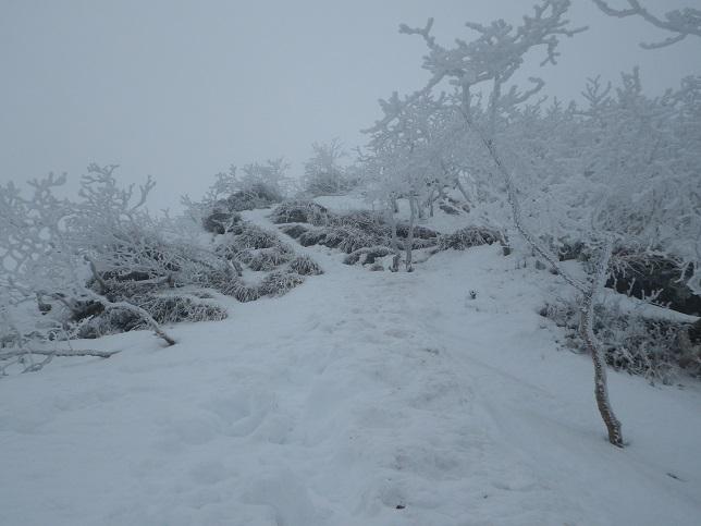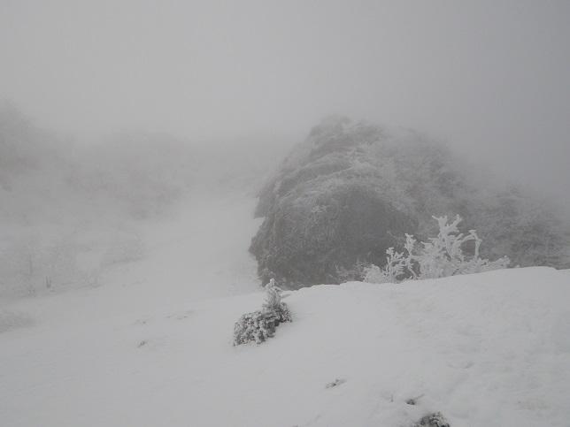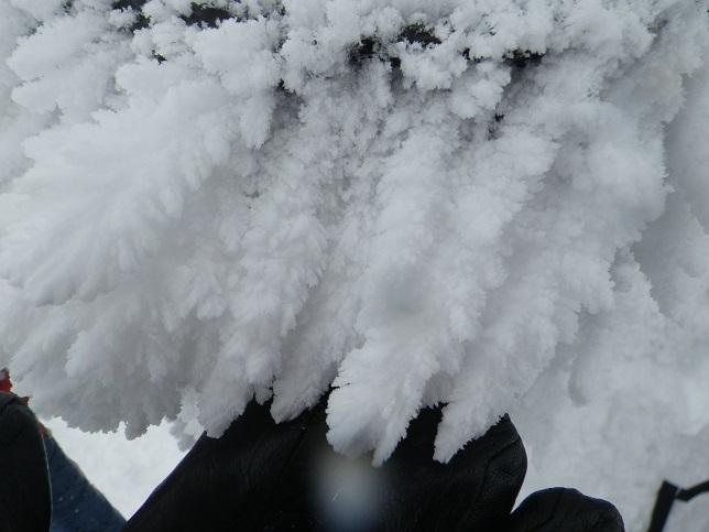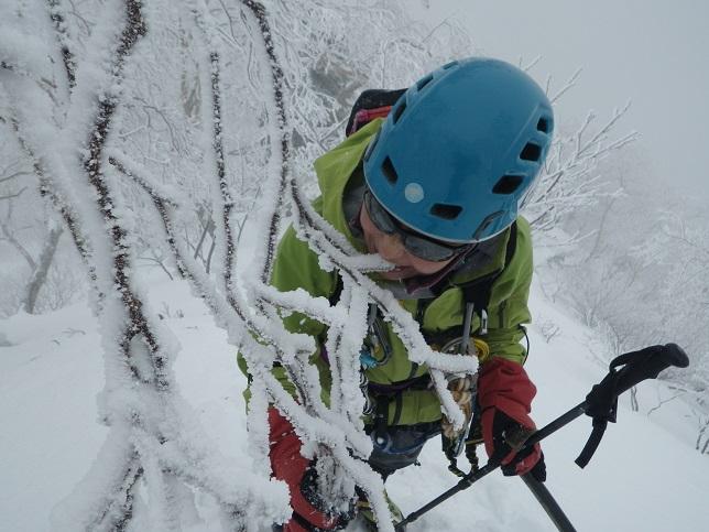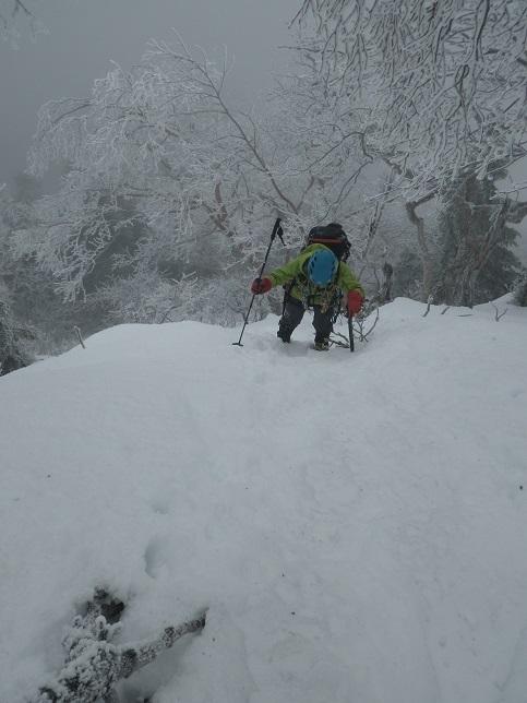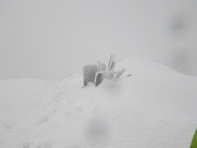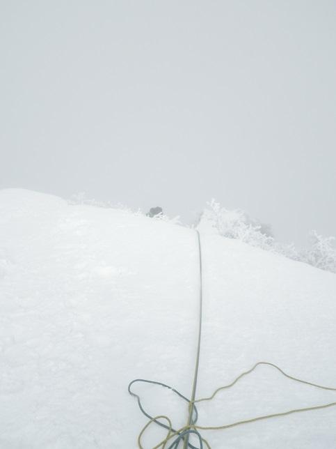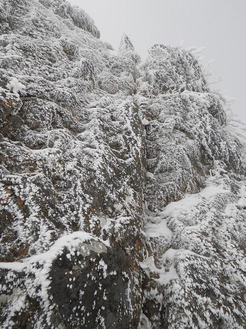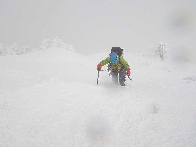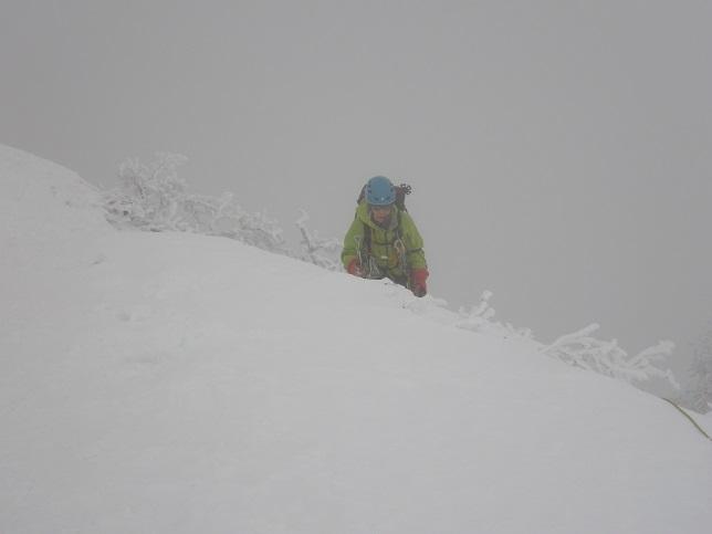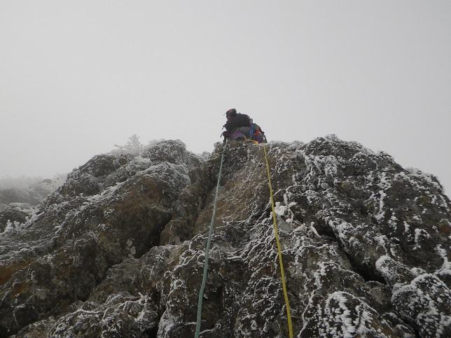 晴れていればすばらしい展望の阿弥陀北稜ですが、今回は霰雪が吹き付ける悪天にて視界不良でした。濡れた靴が凍りました。