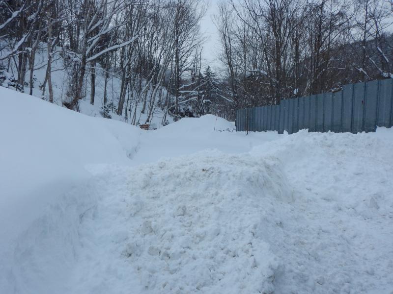- 駐車場 本来は金山沢林道入口に数台停められる駐車スペースがあるはずなのですが、除雪された雪でふさがれていました。向かいのスペースにも工事現場のトラックが…