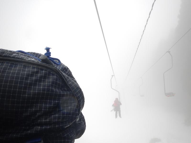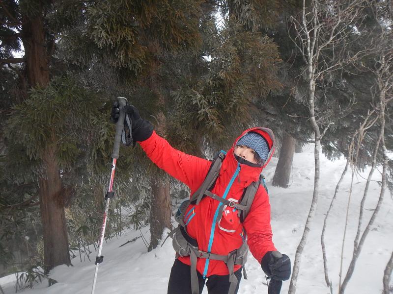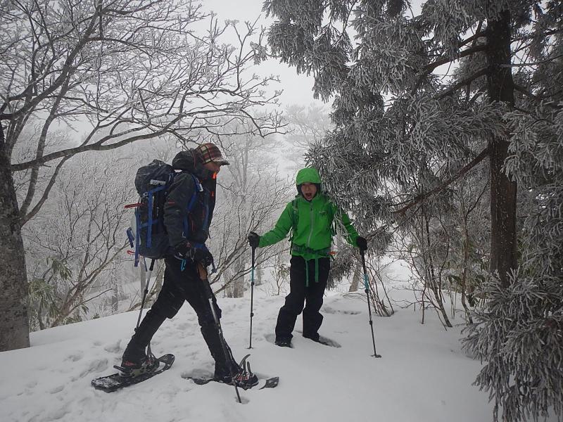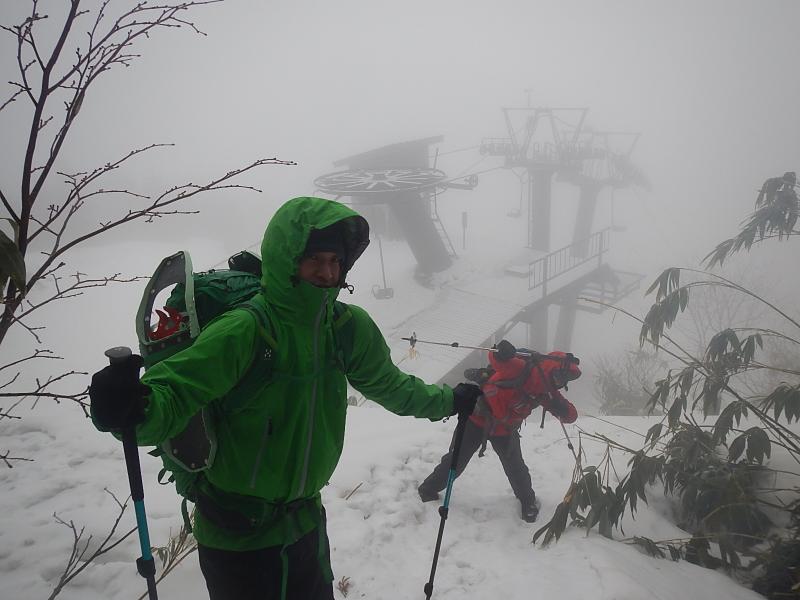 きっと雪になる。萎える気持ちを奮い起こしてスキー場からリフト(2回500円)を乗り継ぎ三ノ丸を目指します。途中トレースを外すと膝まで埋まるところがあったのでスノーシューを履き固めの雪をザクザクと進みます。雨も次第に止み、稜線では綺麗な霧氷がテンションを上げてくれたので、これならと山頂を目指すことにしました。山頂付近は思った通り風が強く、雨でぬれたザックやジャケットが凍りつく始末。雨って怖いですね・・・