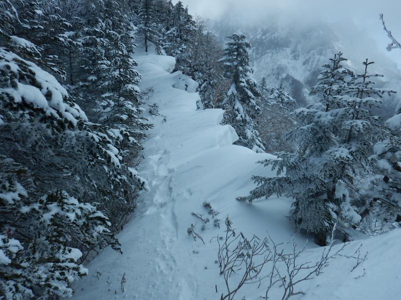 立場山の手前、標高2200~2300mあたりから積雪量がやや増えますが、トレースばっちりでラッセルなし。