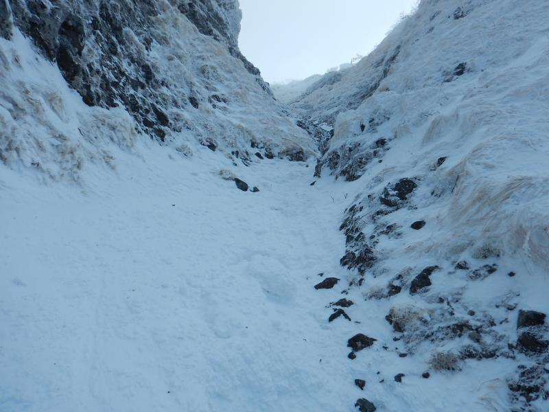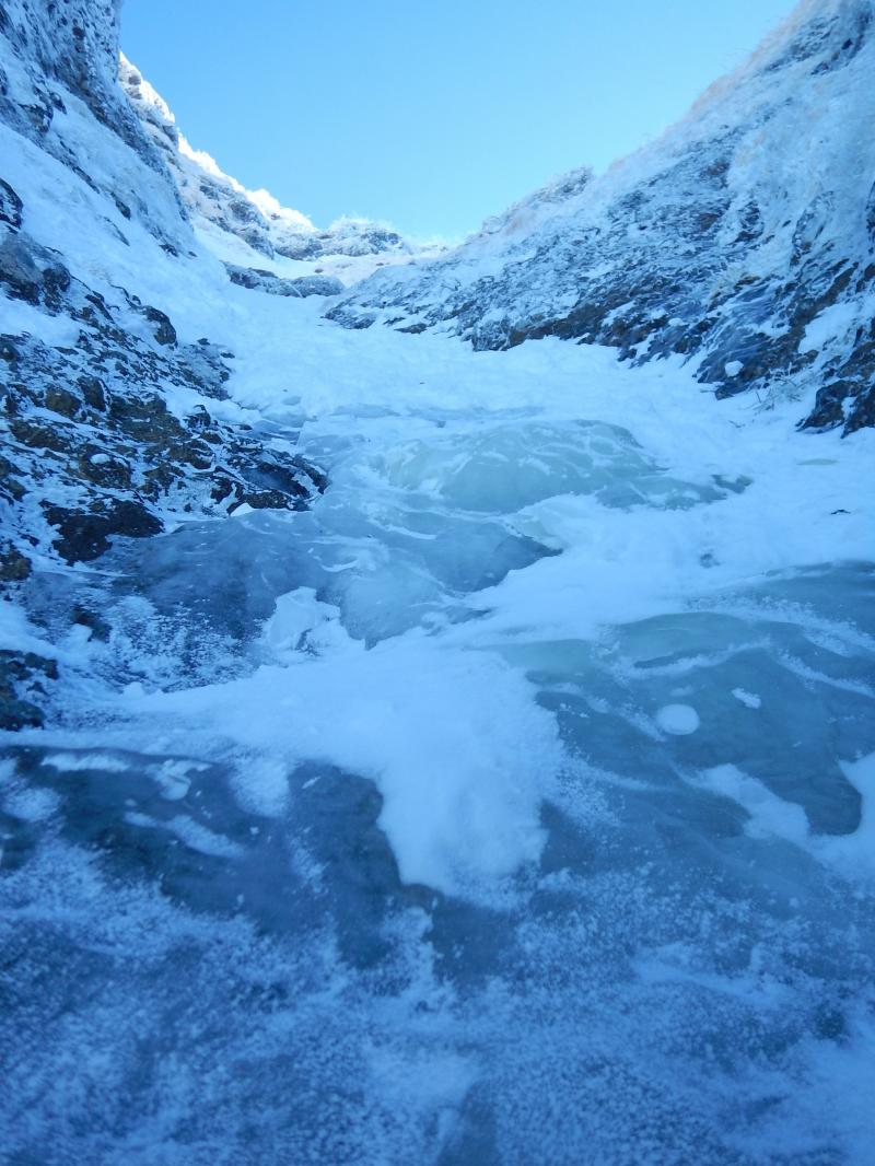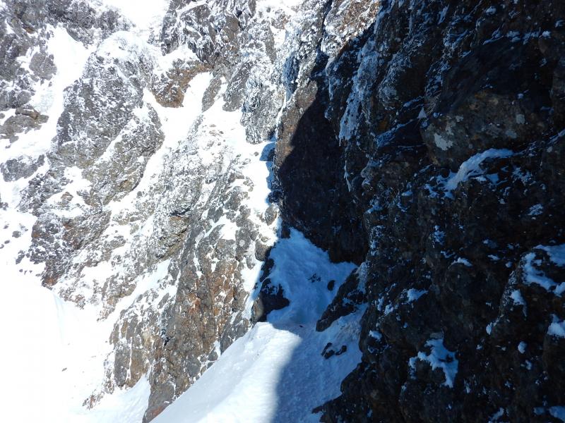 ガリーは一部堅く締まった氷が露出してますが、左右、真ん中好きなように越えたら良いと思います。最大傾斜60度ほどあるそうですが、雪の状態もよく、サクサク抜けられました。上部は左に上がるよりも真ん中あたりから上がった方が最後楽だと思います。抜けたら絶景が待ってます。