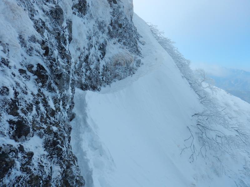 無名峰からすぐ、右手に雪庇が出てます。P1は直登。P2は基部を左に巻きます。