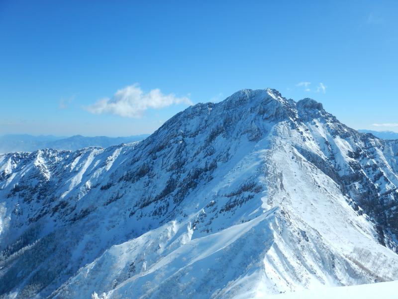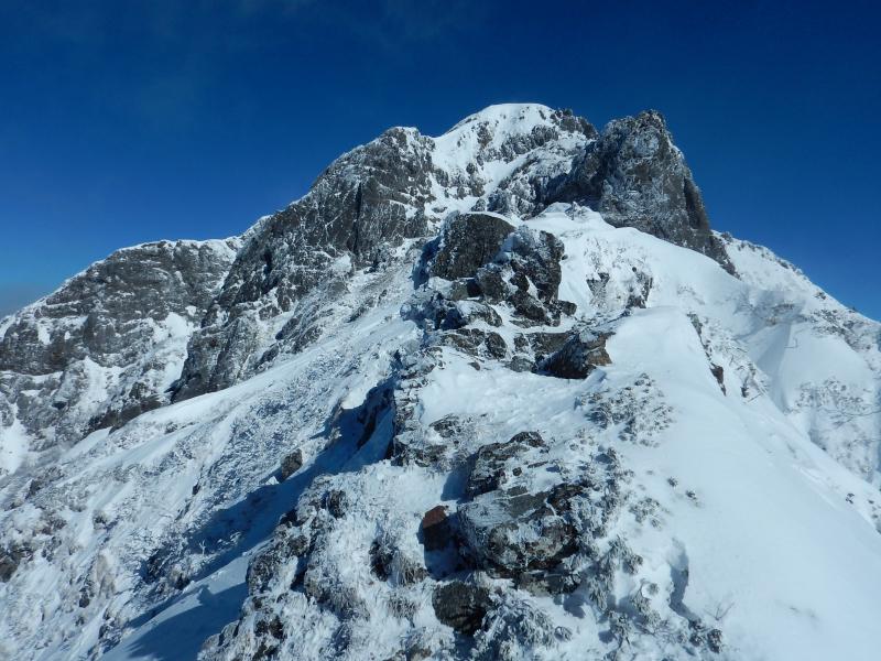 頂上直下の岩壁を右に回り込むと最後の雪壁です。好きに登ってください。あとは赤岳を背にゆるい傾斜を詰めると頂上です。天気が良ければ至福のひと時を味わえます。
