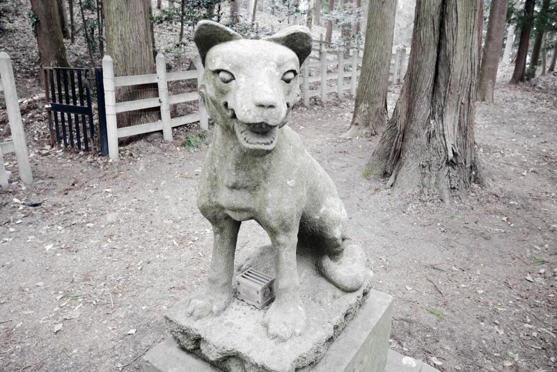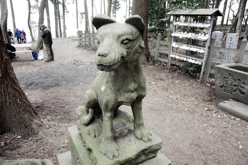 奥宮は20度近い気温にも関わらずひんやりとして「神様いるな」感がよく伝わってきました。この山いちばんのパワースポットと言って間違いないでしょう。狛犬は狼風のつるっとしたお犬様です。奥宮からすこしだけ歩くと山頂です。