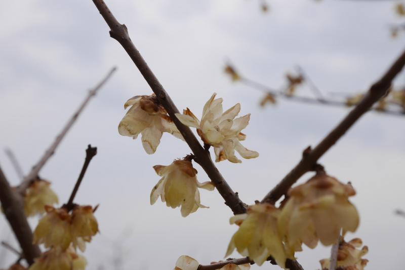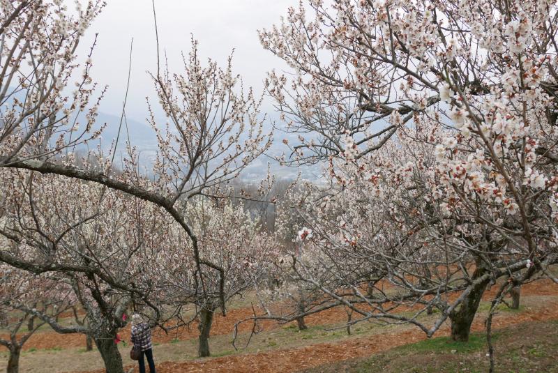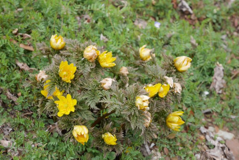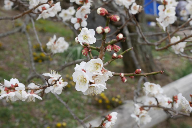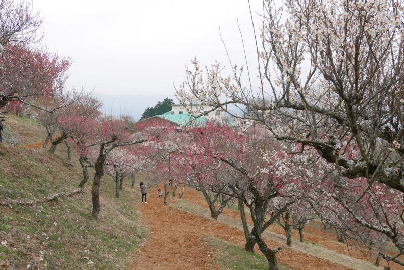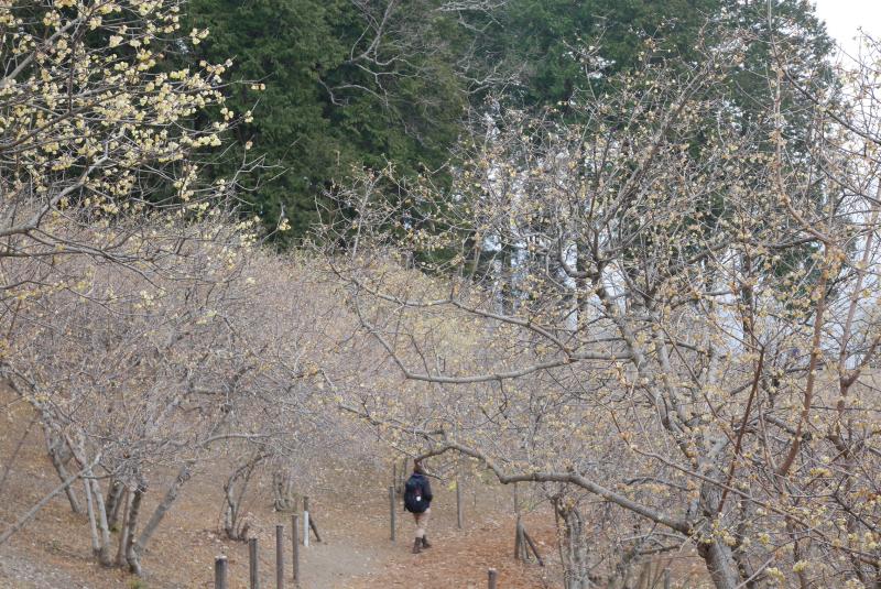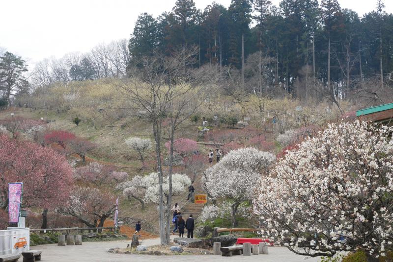 山頂直下は梅園が広がっていて、ロウバイはほとんど終わりかけていましたが、梅が見事でした。よく見ると鹿児島など各地の梅が植えられていて、170品種と関東一品種が多いそうです。無料とは思えないすばらしさで、ちゃんと手入れがいき届いてるなと感心しました。福寿草も咲いていて、花を満喫できました。歩いていると上品な梅の香りがしてきてすばらしいのですが、同行のKはひどい花粉症でティッシュが手放せず、なかなか辛そうです。