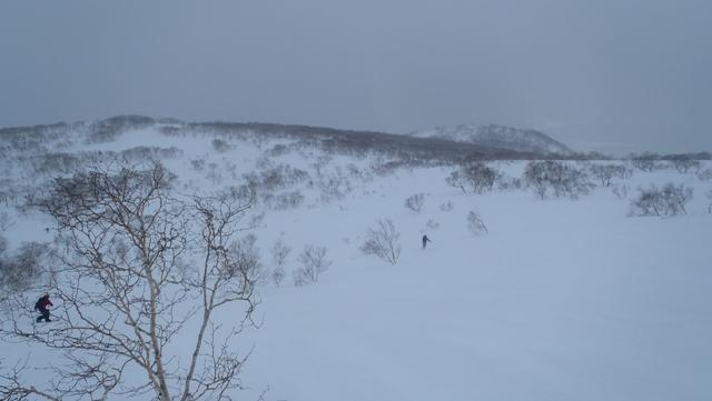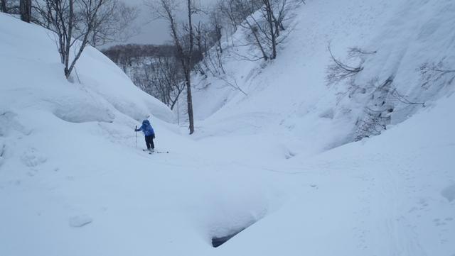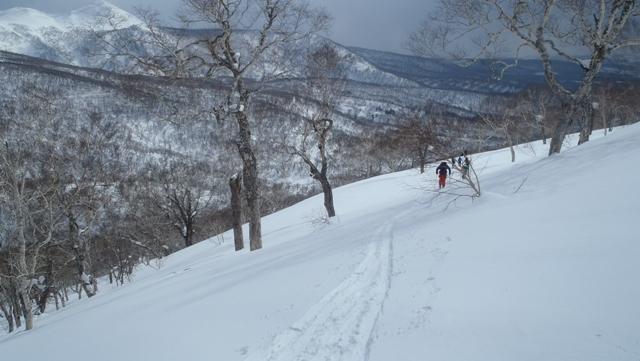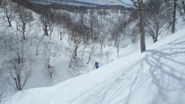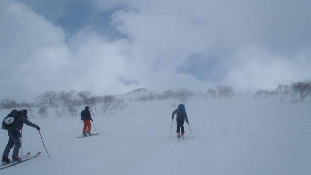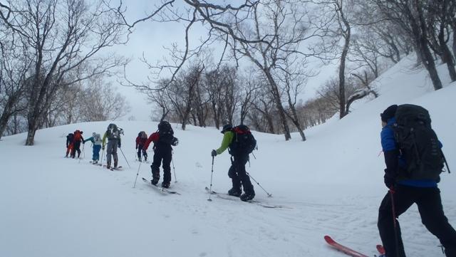 この春惜しまれつつ営業を終える新見温泉から目国内岳に行ってきました。林道を少し歩いて沢を渡るとあとは疎林帯がずっと続きます。うまくルート取るとほとんど登り返しもなし。今回は天気がイマイチで頂上手前で短時間ながらホワイトアウト状態!それでも粘り強く前進を続け、全員が登頂!下りの楽しみの滑降は皆さん、上手い上手い!ガリガリのアイスバーンもなんのその。あっという間に下山となりました。
